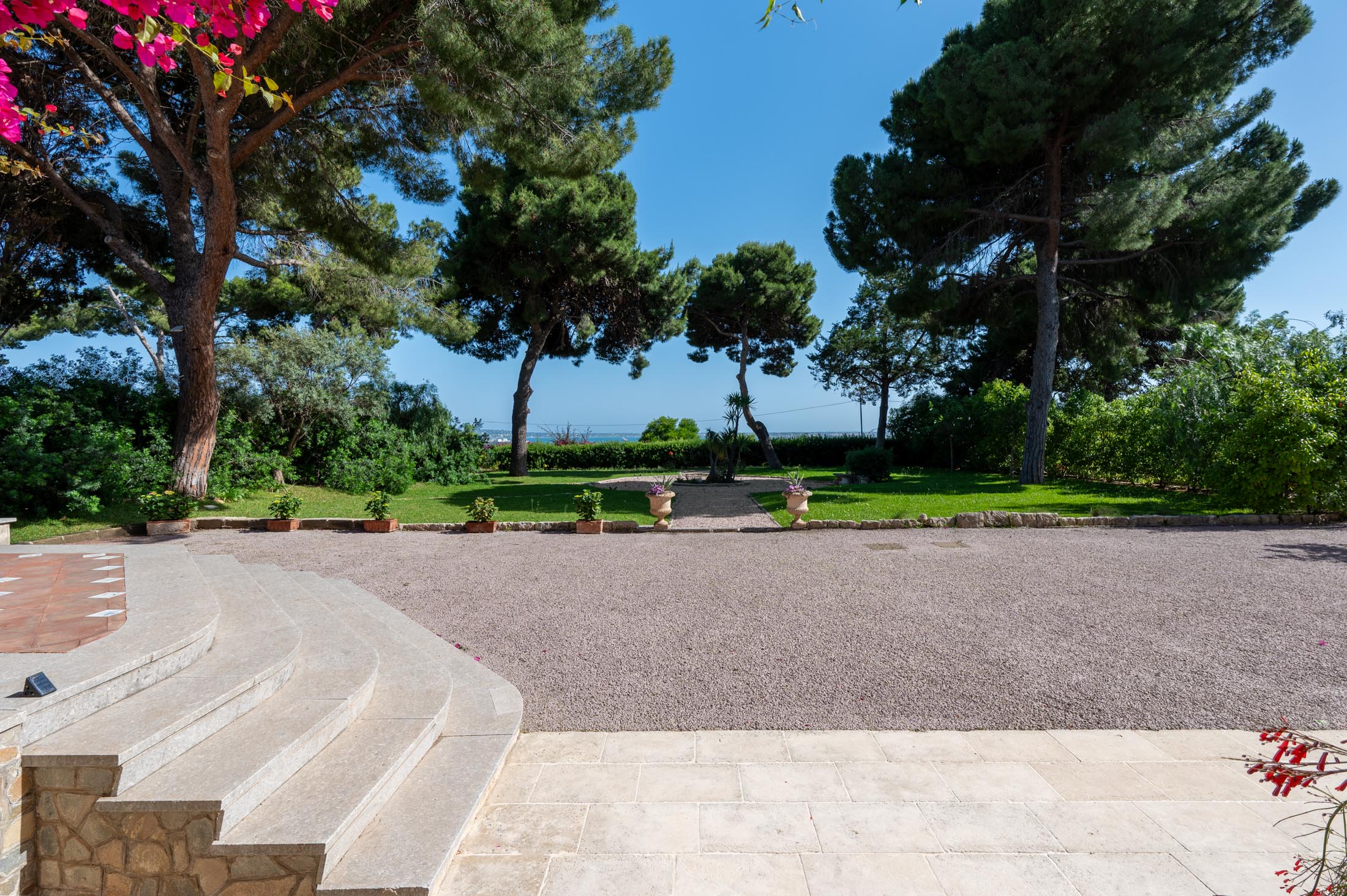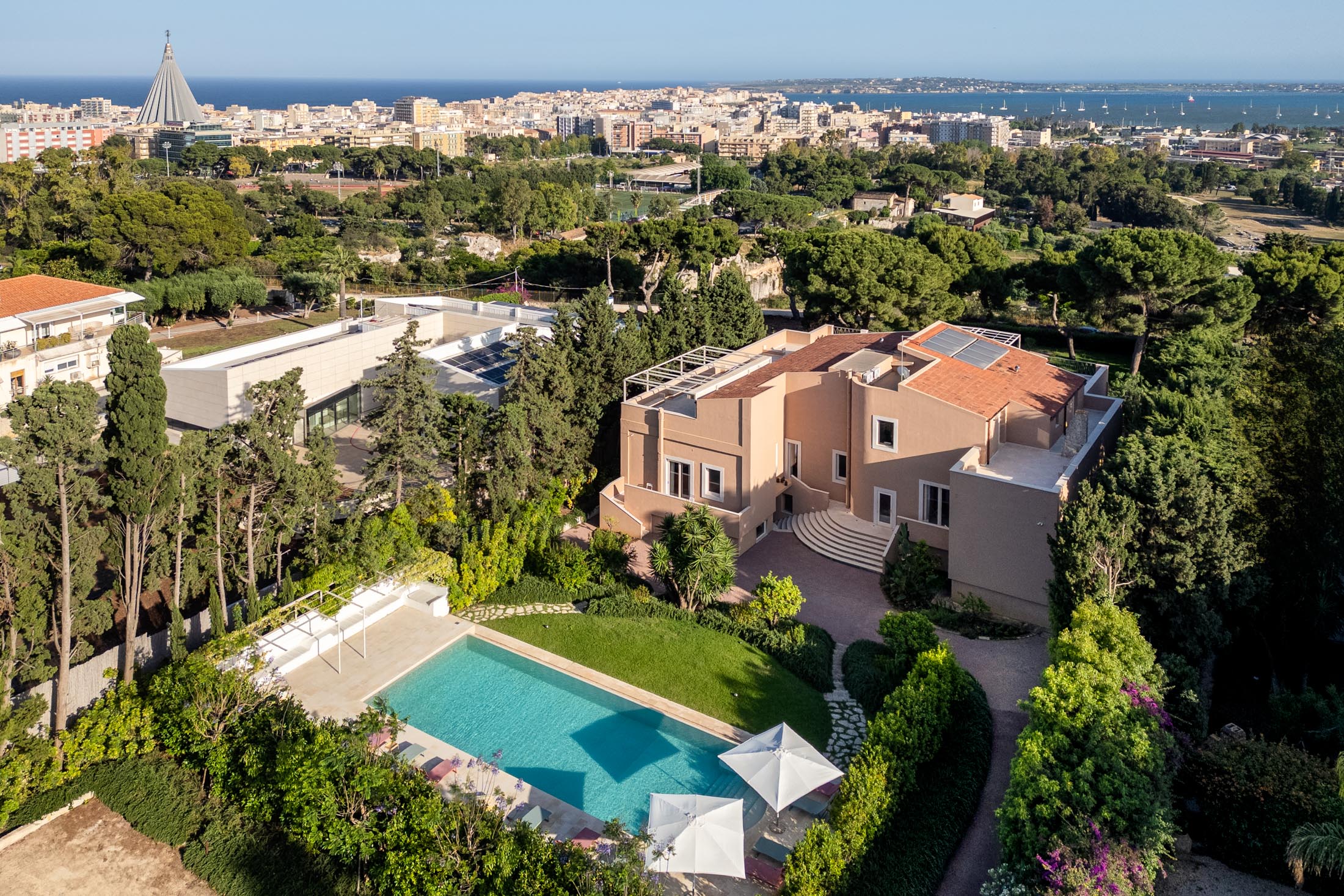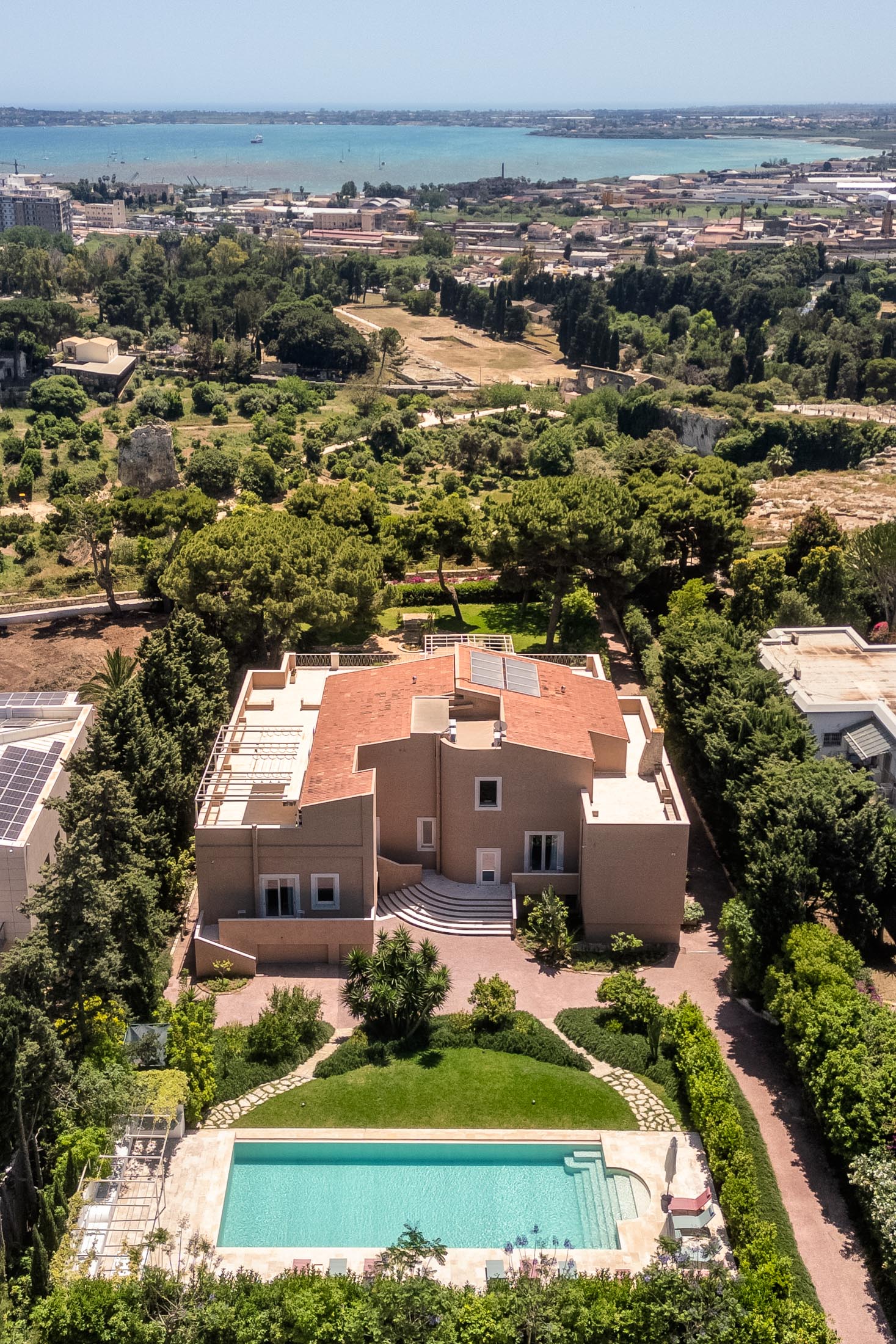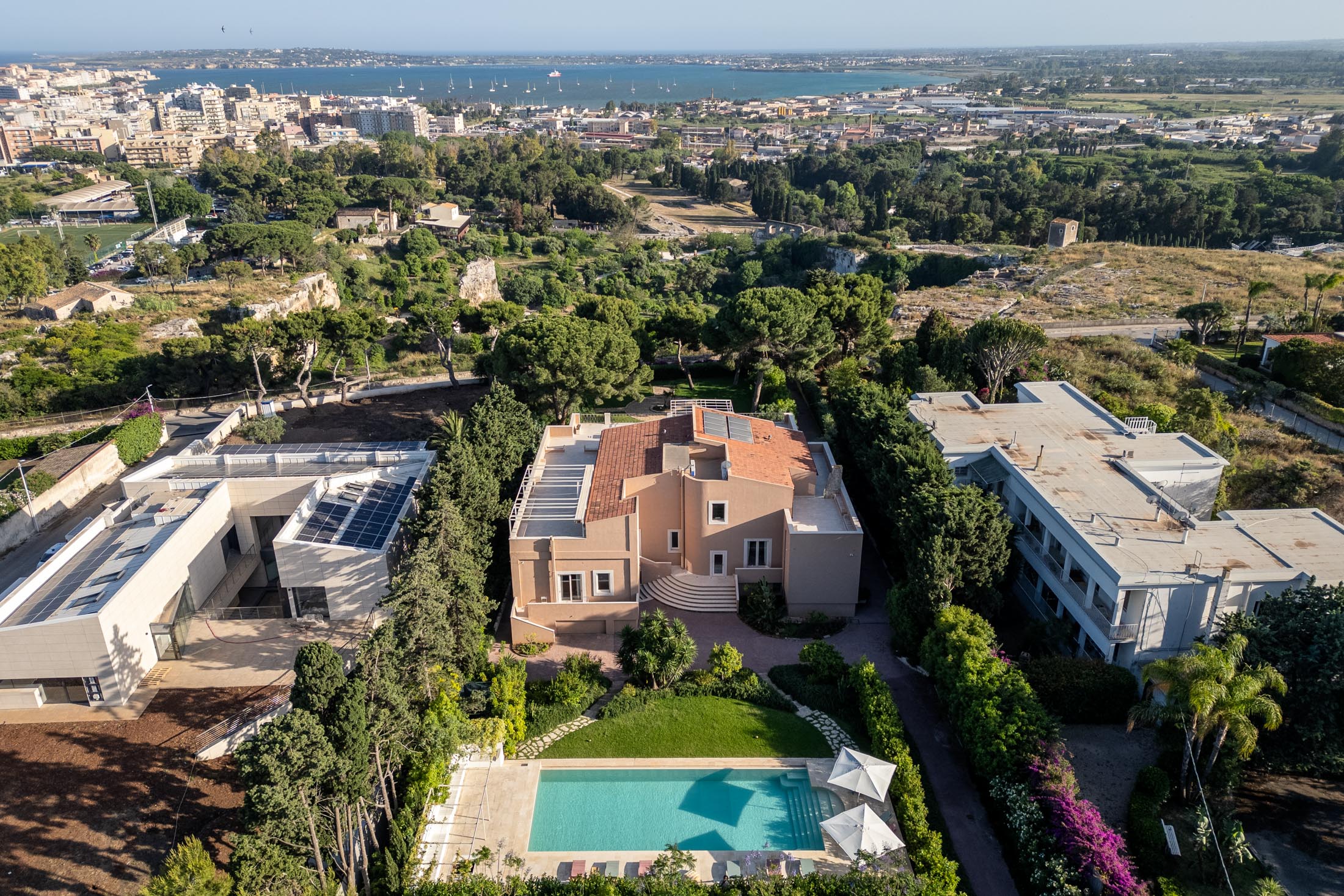 Surrounded by an expansive 4,000-square-metre garden, the villa overlooks the Greek Theatre and the Ear of Dionysius, offering beautiful sea views and a peaceful residential atmosphere. The outdoor spaces recall the grandeur of panoramic international villas, enriched with authentic Sicilian character. At the rear of the house, a classically inspired Italian garden complements a large swimming pool framed by laurel hedges, jacaranda, pomegranate, and lemon trees.