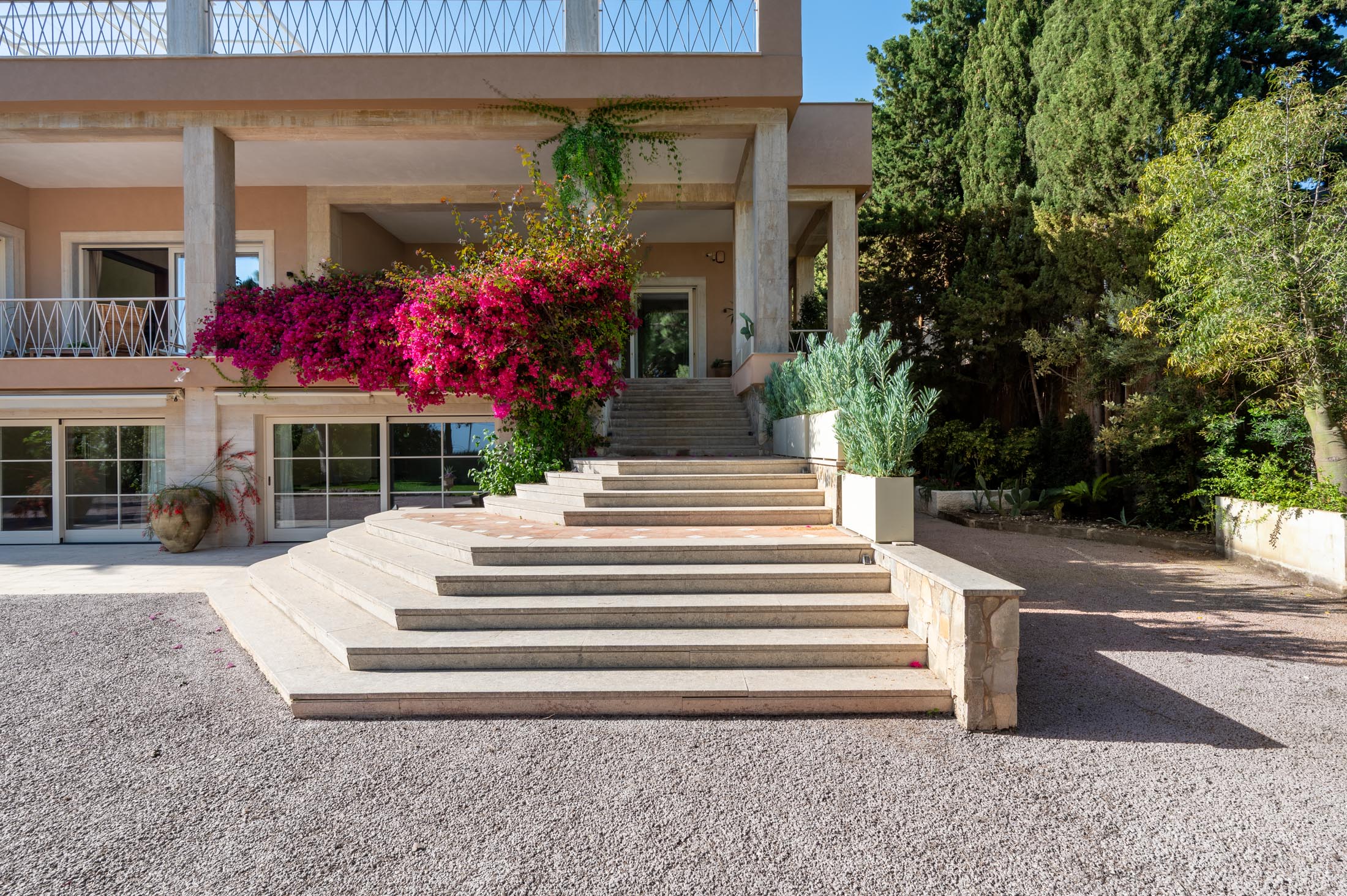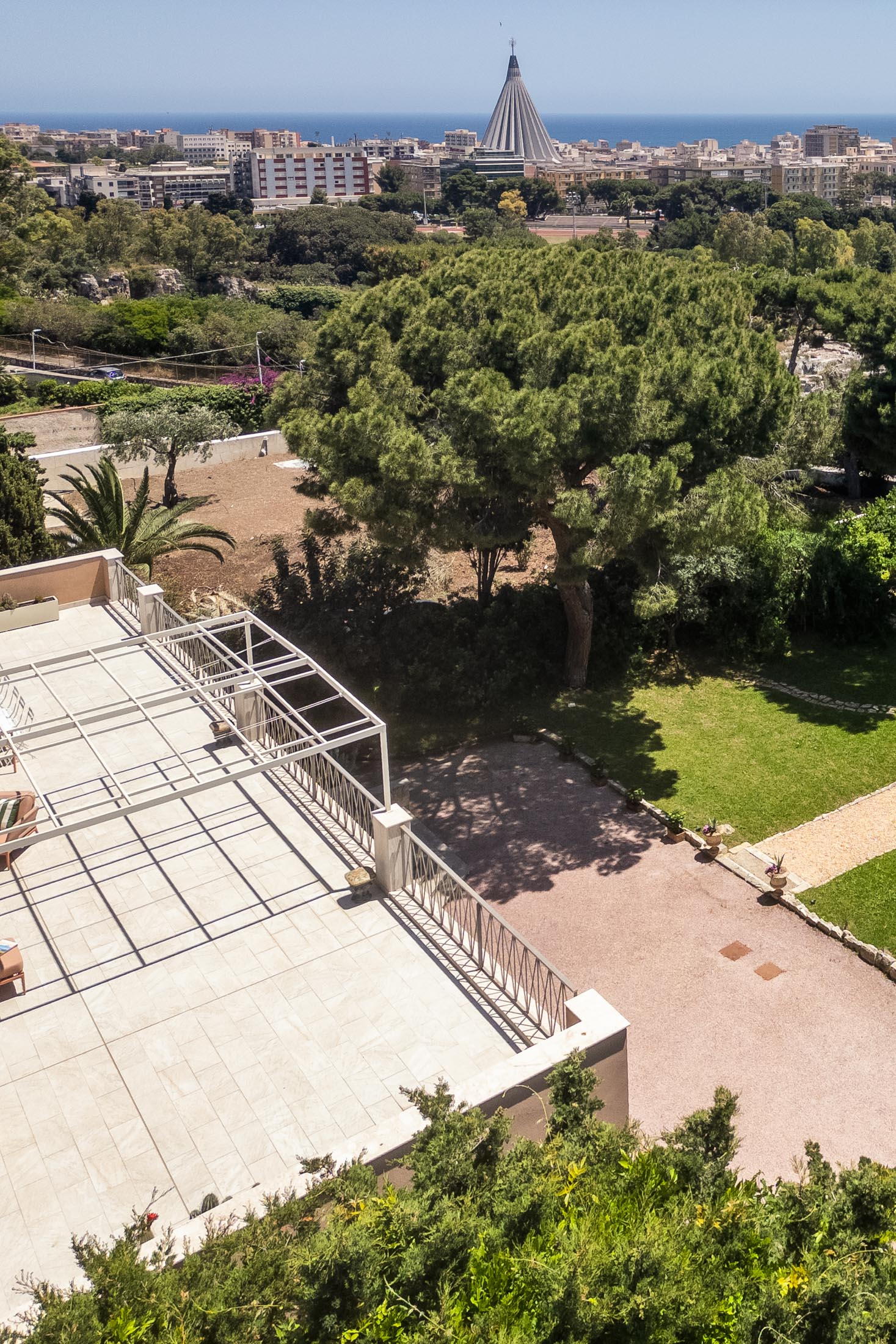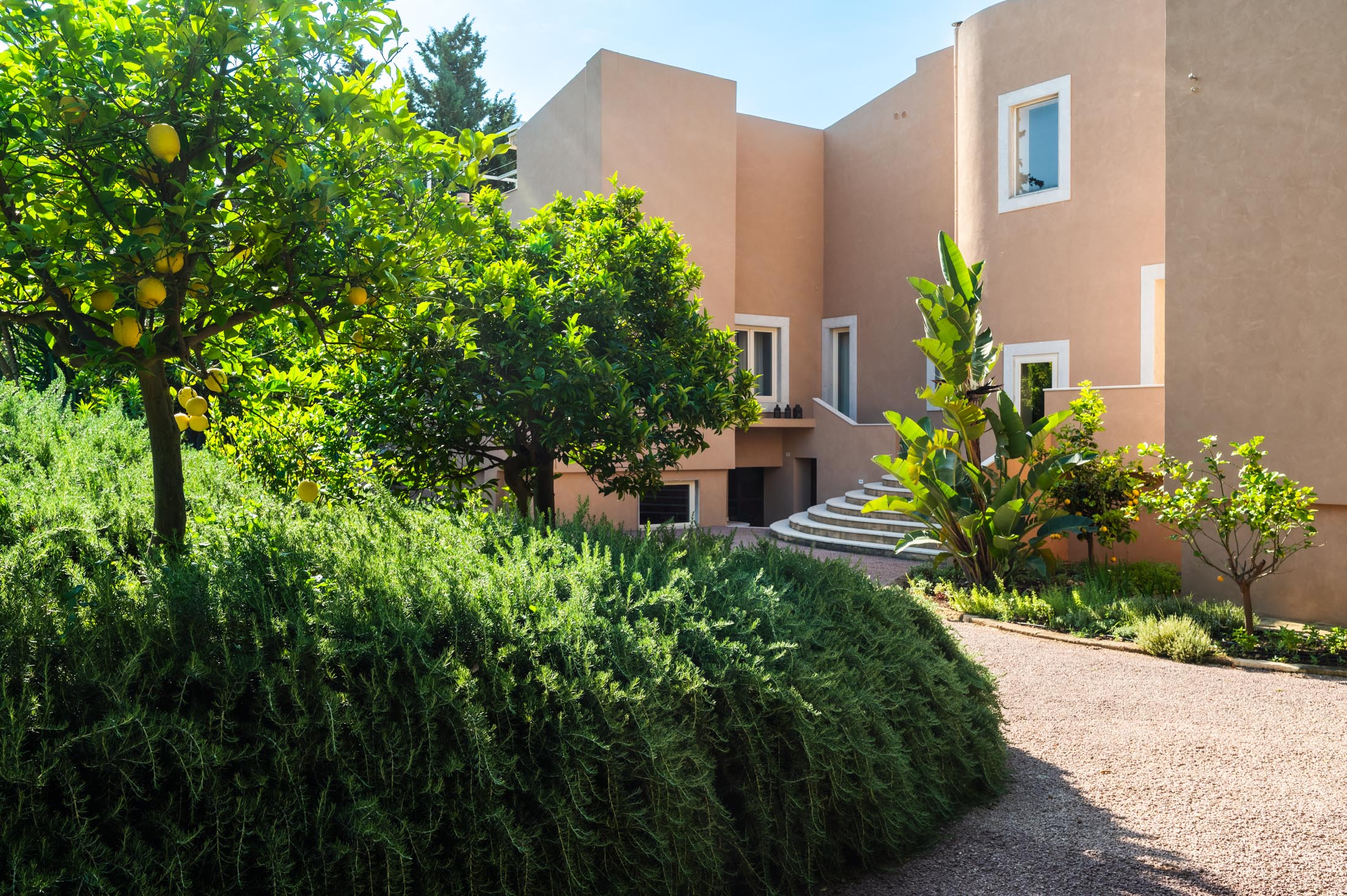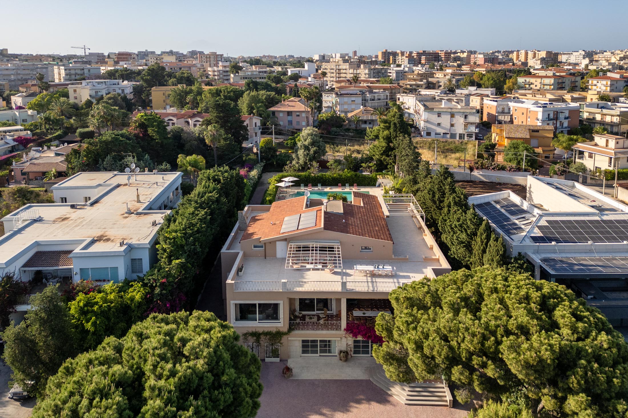 Surrounded by an expansive 4,000-square-metre garden, the villa overlooks the Greek Theatre and the Ear of Dionysius, offering beautiful sea views and a peaceful residential atmosphere. The outdoor spaces recall the grandeur of panoramic international villas, enriched with authentic Sicilian character. At the rear of the house, a classically inspired Italian garden complements a large swimming pool framed by laurel hedges, jacaranda, pomegranate, and lemon trees.