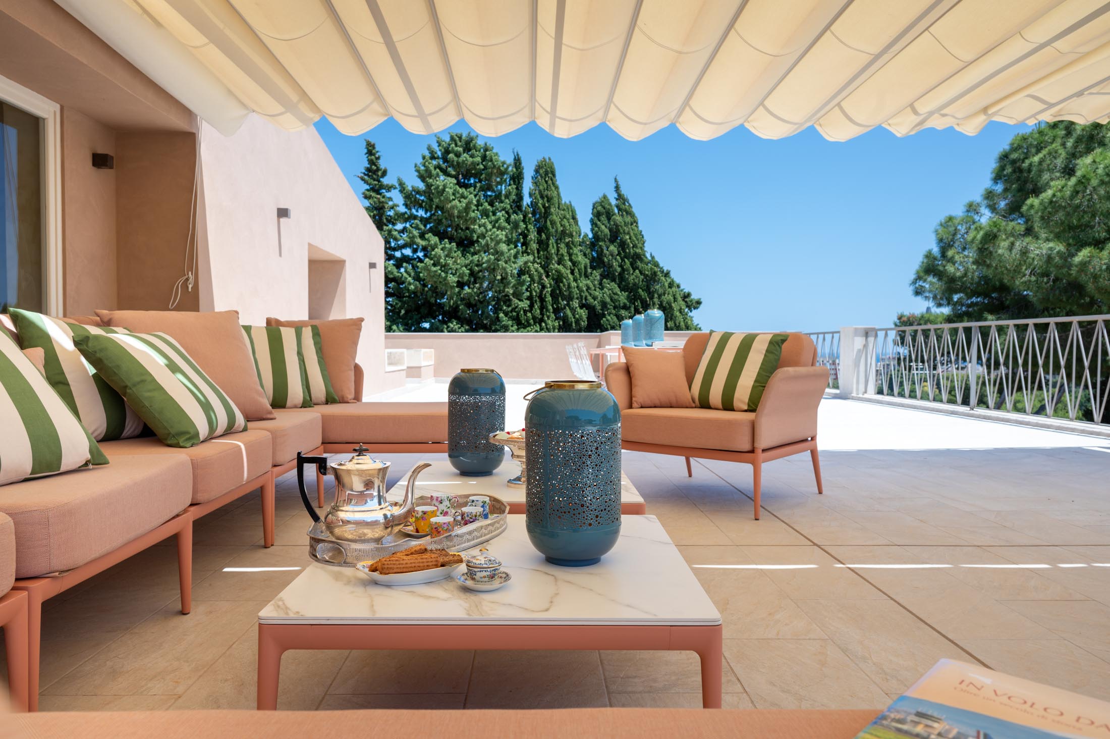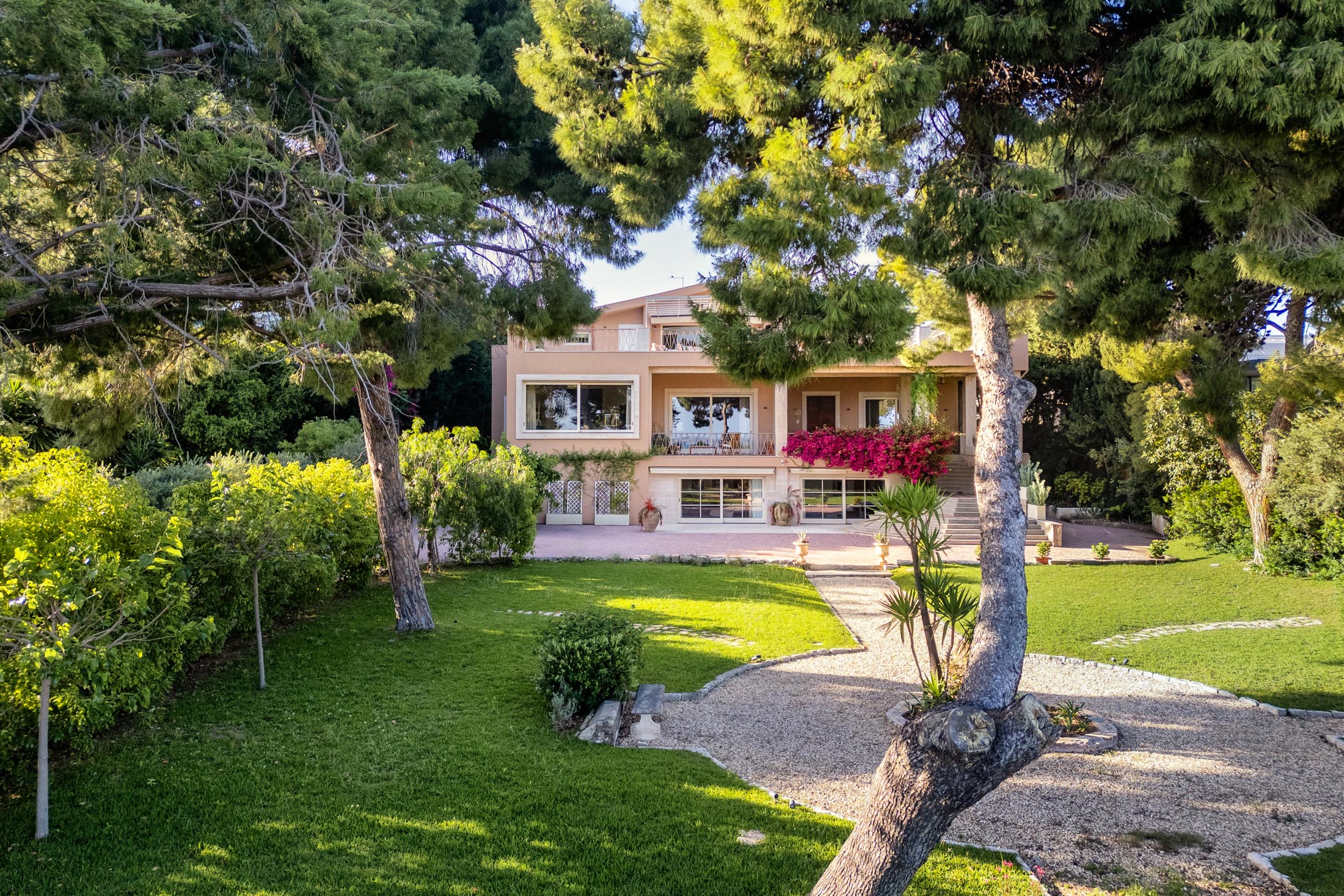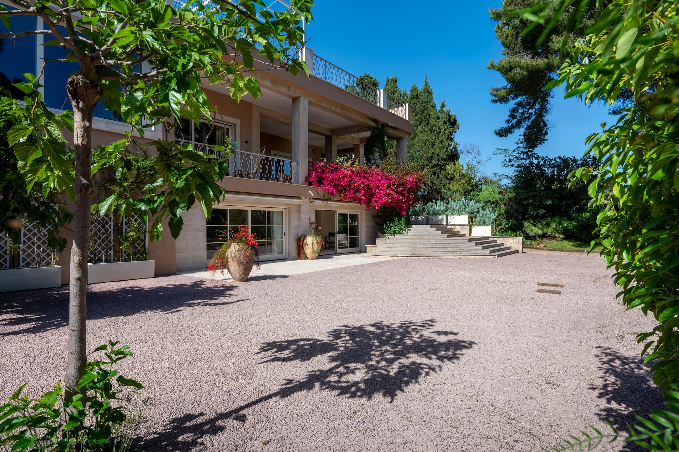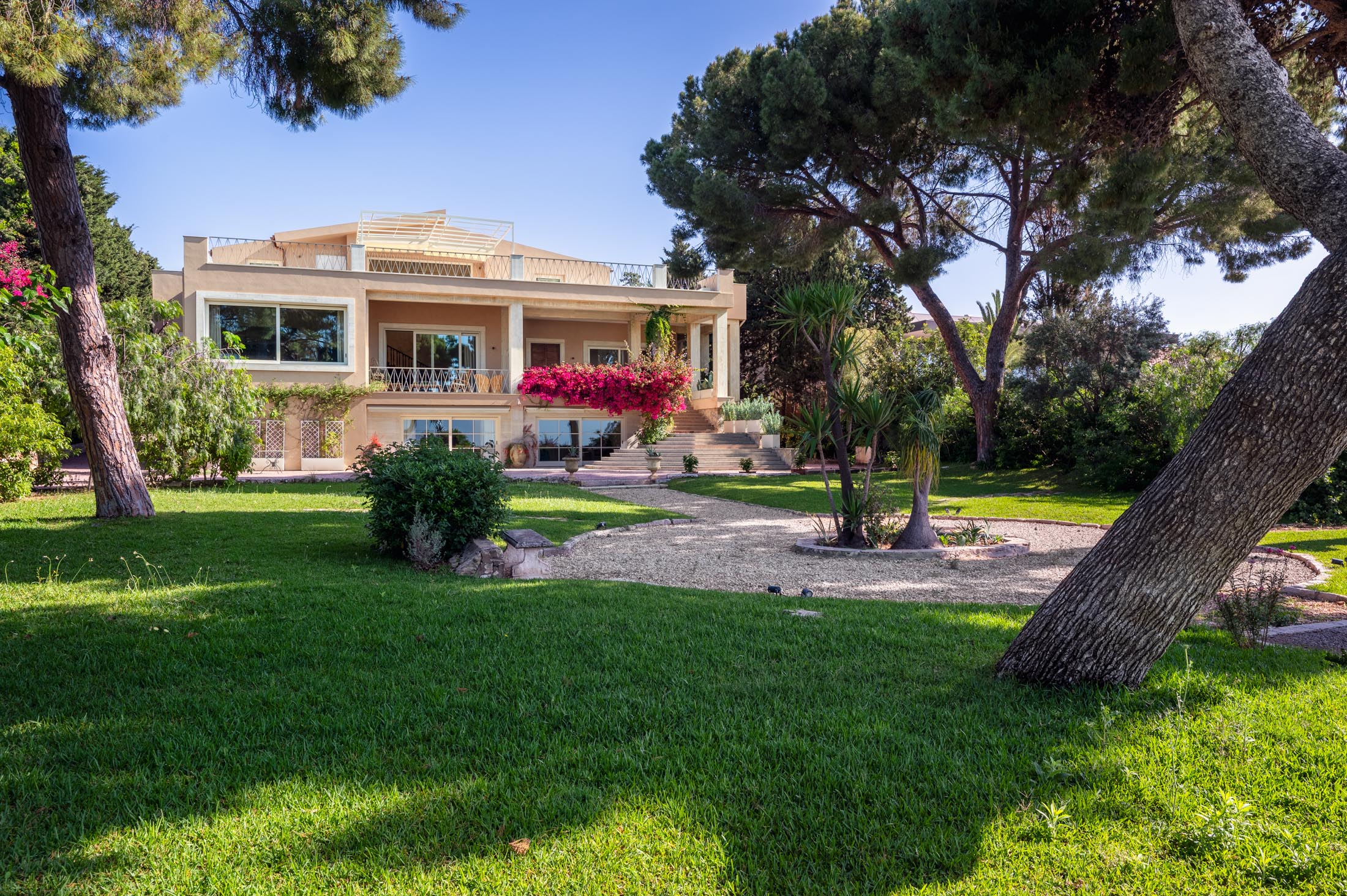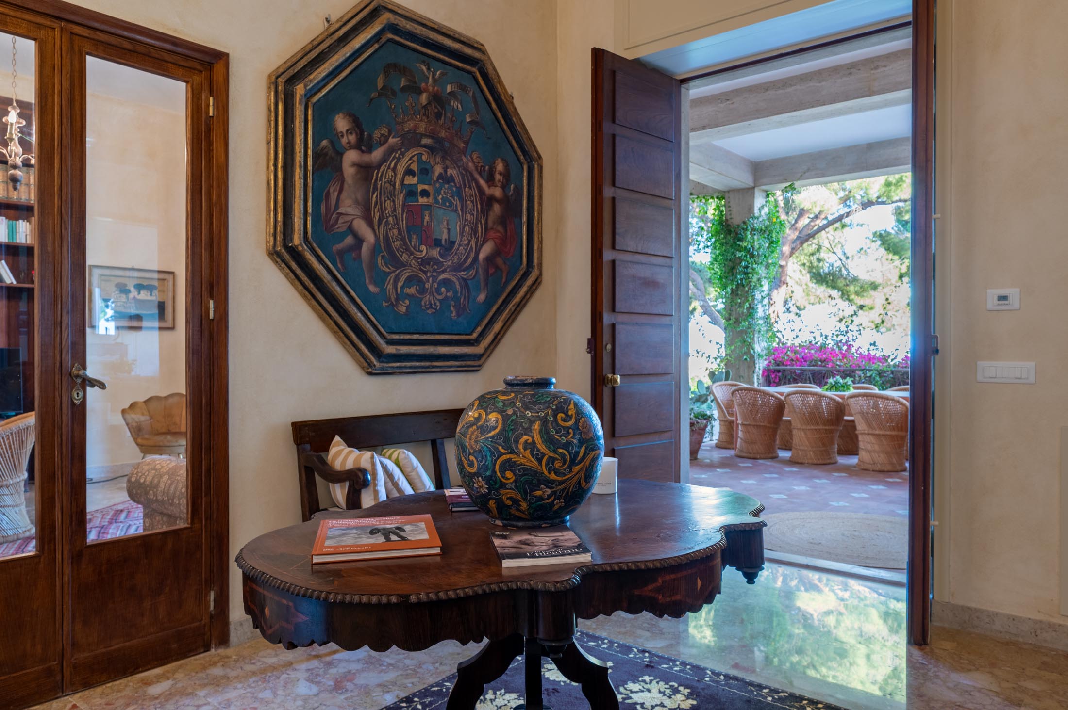 Surrounded by an expansive 4,000-square-metre garden, the villa overlooks the Greek Theatre and the Ear of Dionysius, offering beautiful sea views and a peaceful residential atmosphere. The outdoor spaces recall the grandeur of panoramic international villas, enriched with authentic Sicilian character. At the rear of the house, a classically inspired Italian garden complements a large swimming pool framed by laurel hedges, jacaranda, pomegranate, and lemon trees.