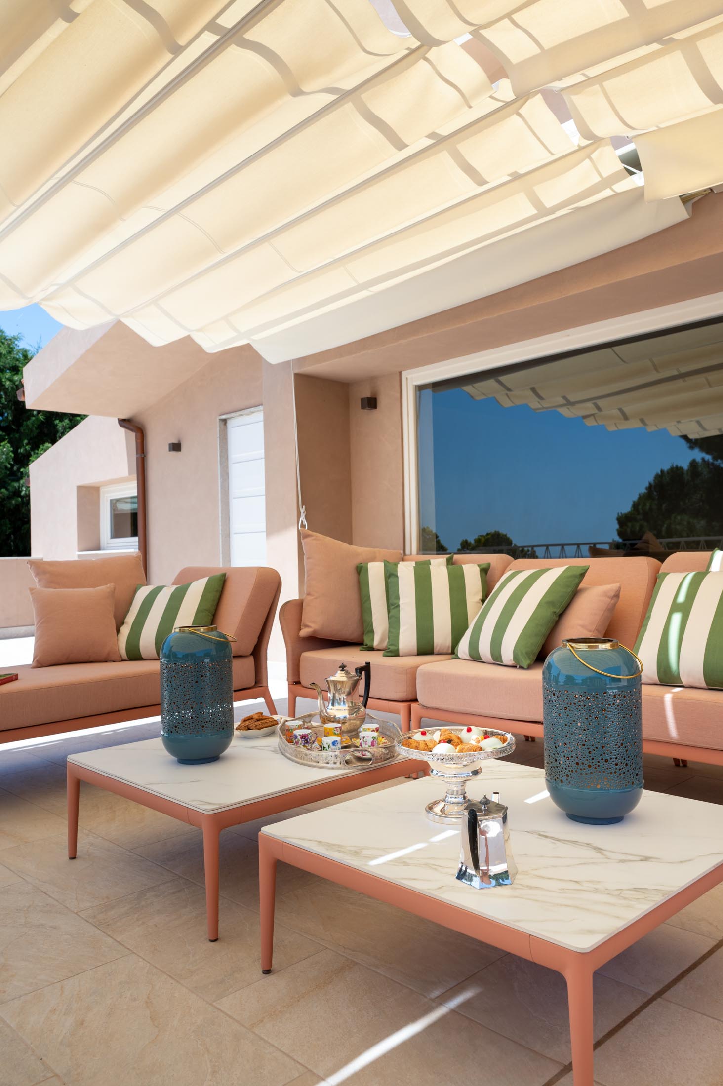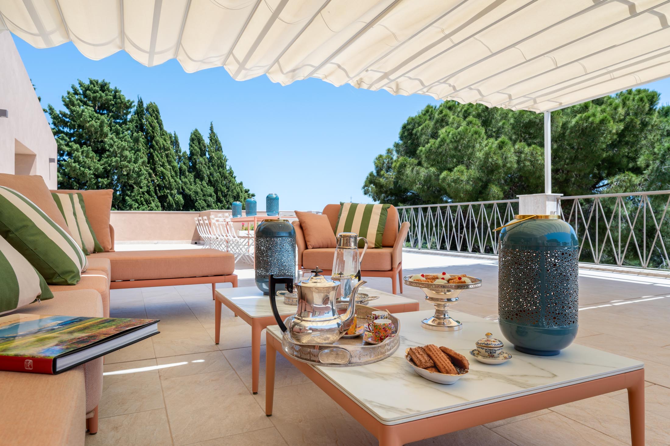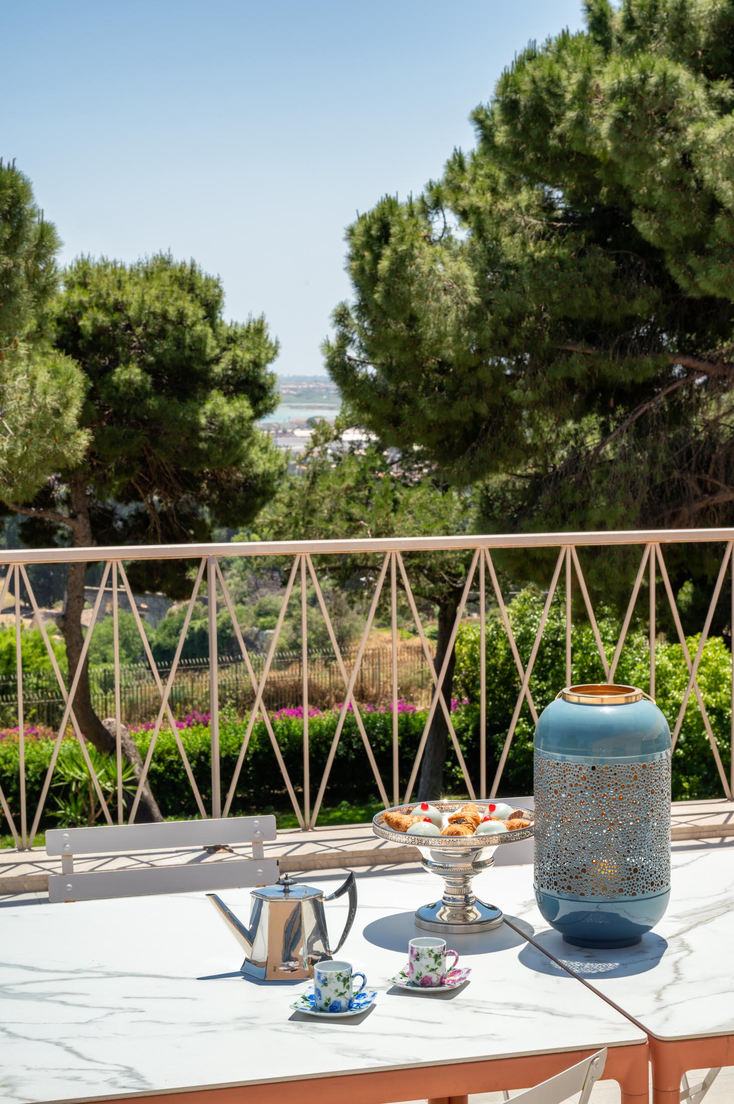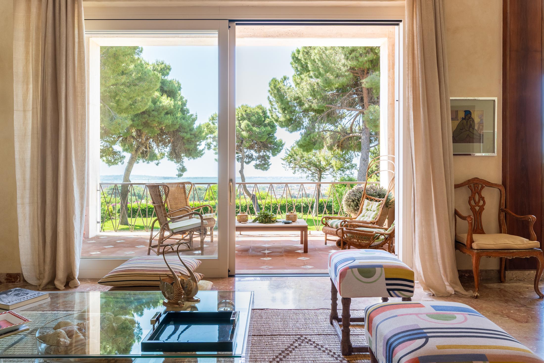 Surrounded by an expansive 4,000-square-metre garden, the villa overlooks the Greek Theatre and the Ear of Dionysius, offering beautiful sea views and a peaceful residential atmosphere. The outdoor spaces recall the grandeur of panoramic international villas, enriched with authentic Sicilian character. At the rear of the house, a classically inspired Italian garden complements a large swimming pool framed by laurel hedges, jacaranda, pomegranate, and lemon trees.