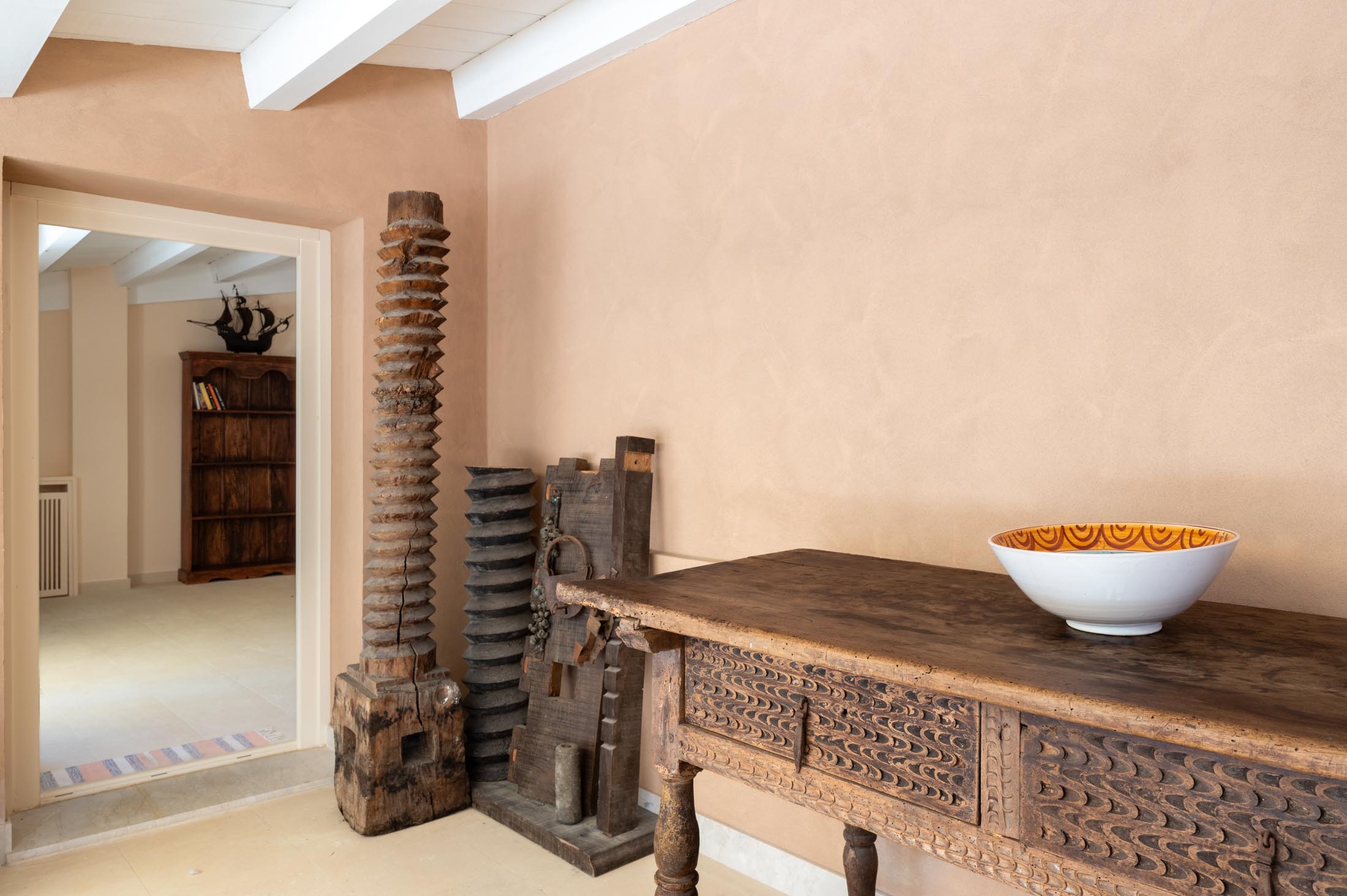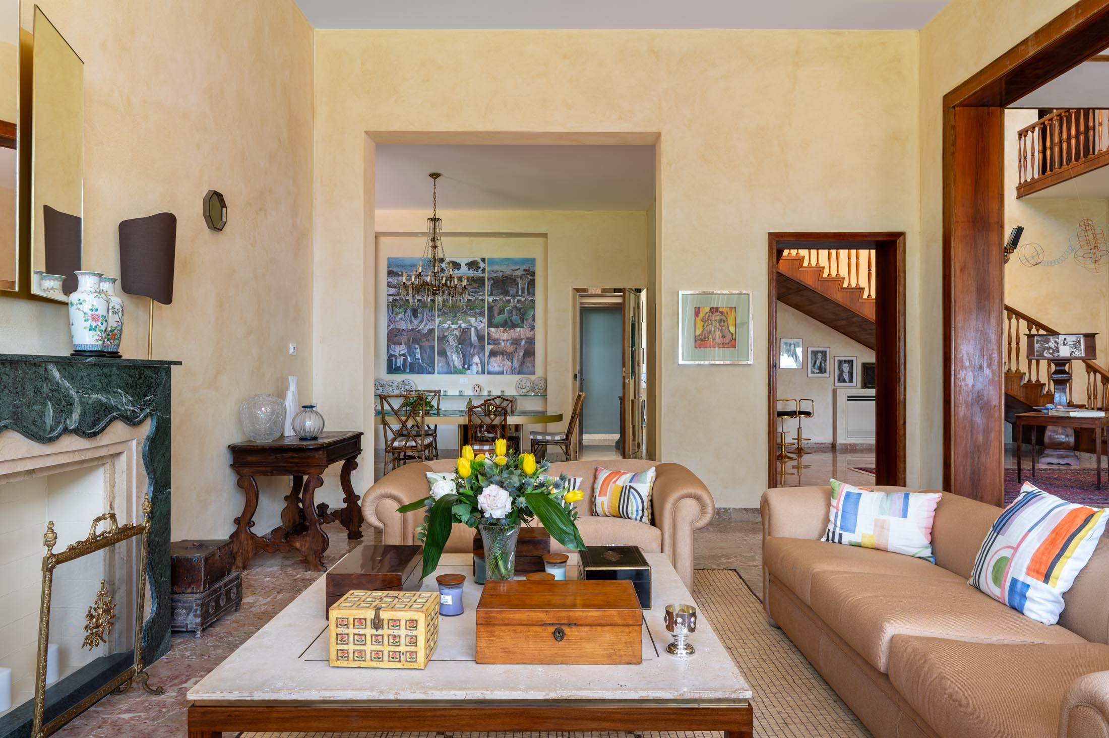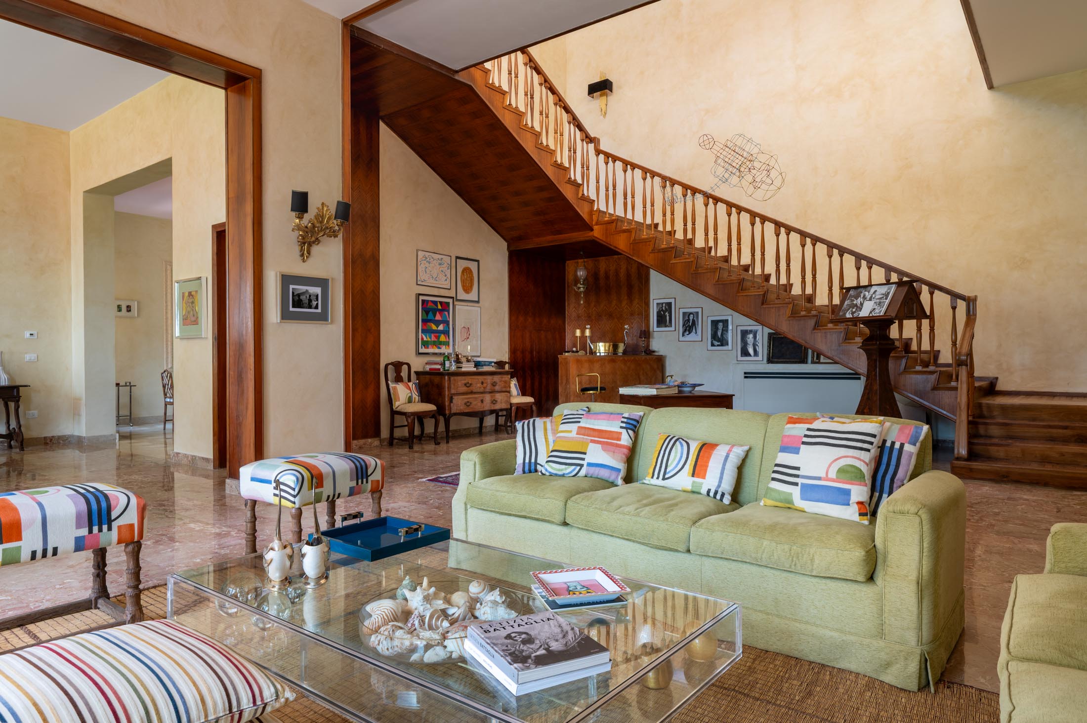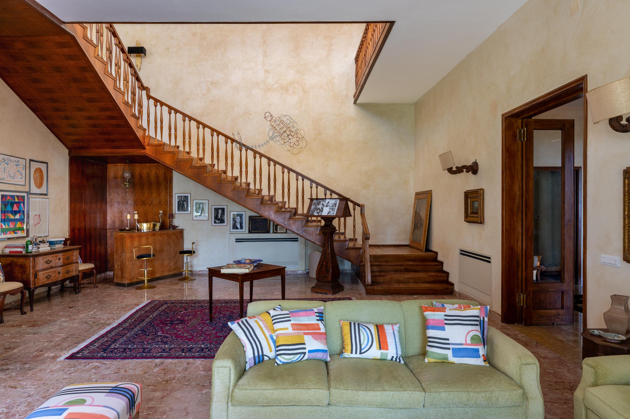 The main staircase opens onto a spacious living area with a bright, sweeping lounge designed for comfort and relaxation. This level includes a conversation area, a second seating space with sofas and a fireplace, and a dining room. A charming retractable bar in original 1950s style, a games area with a pool table, and a comfortable study complete the setting. Adjacent to the dining area are a breakfast room and a fully equipped kitchen.