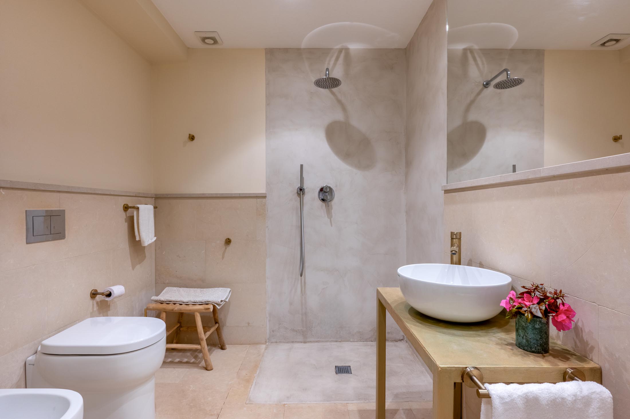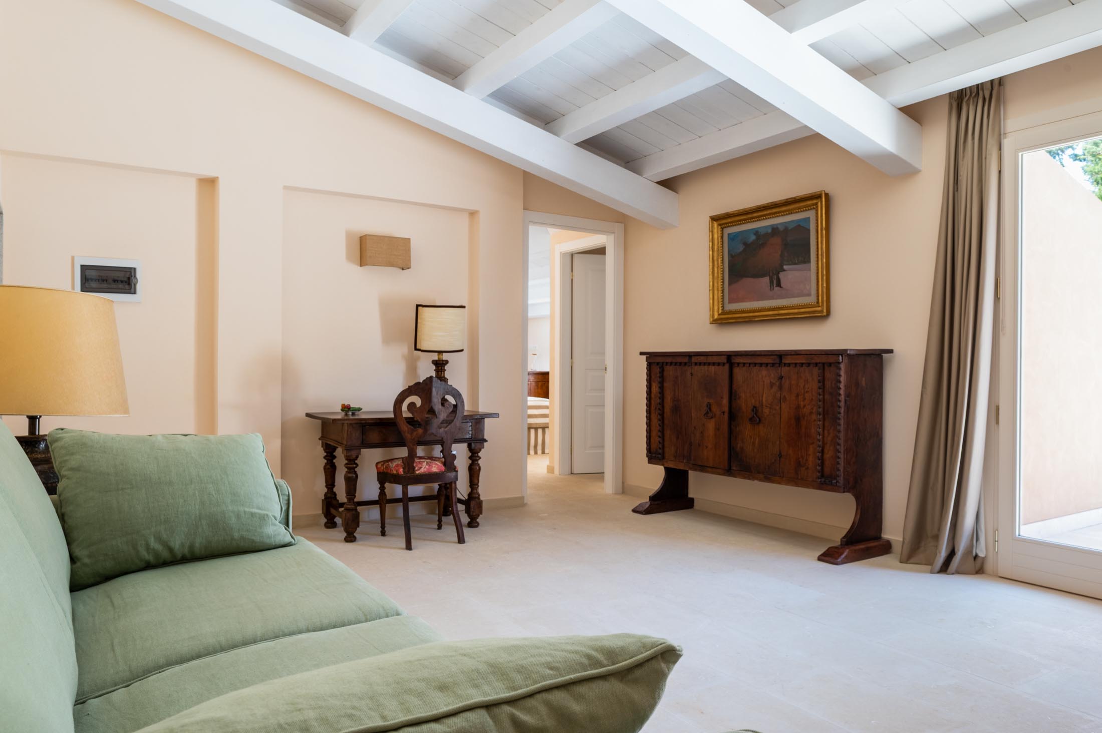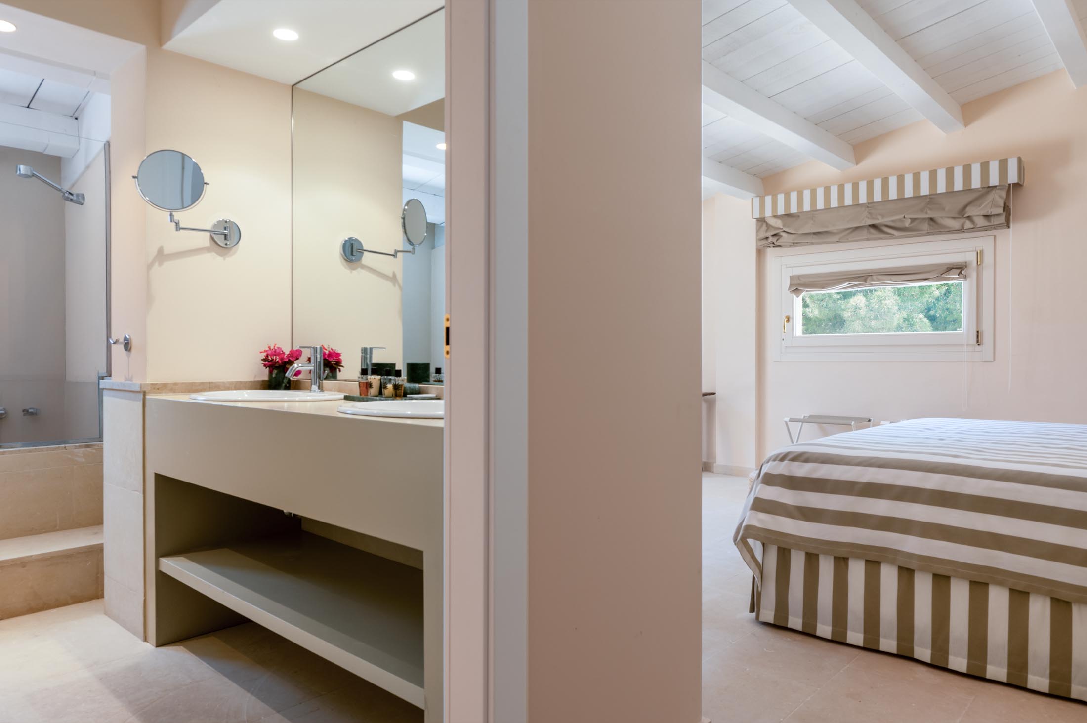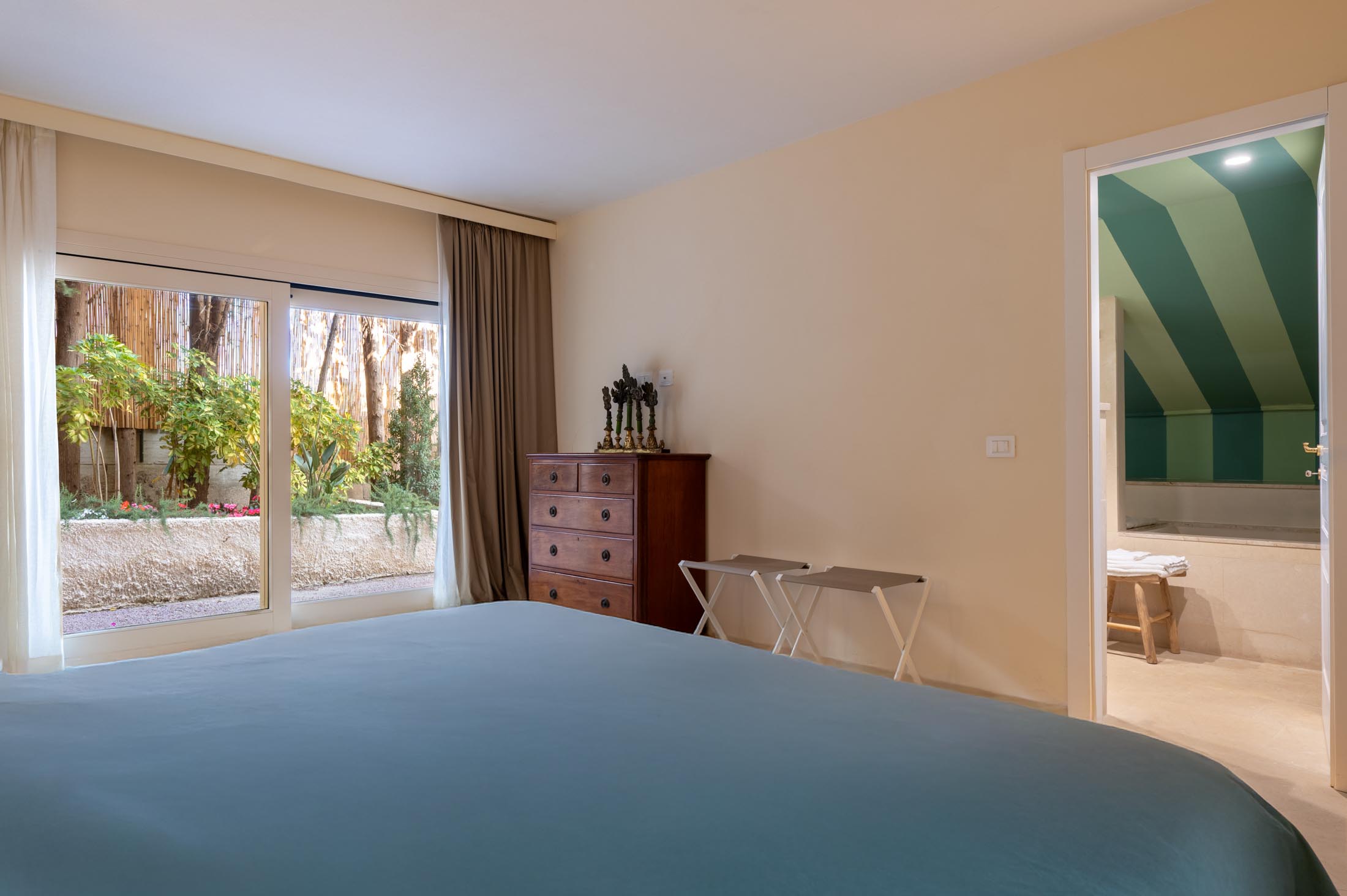On the same floor, two suites and additional bedrooms offer private bathrooms, terraces, and direct garden access. Each sleeping area is thoughtfully separated from the common spaces to ensure maximum privacy for guests.