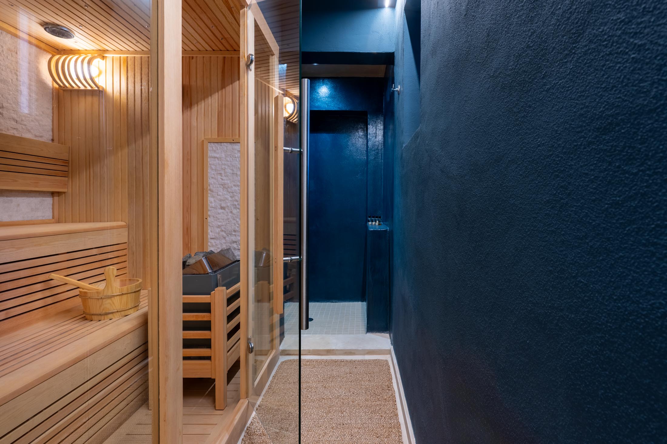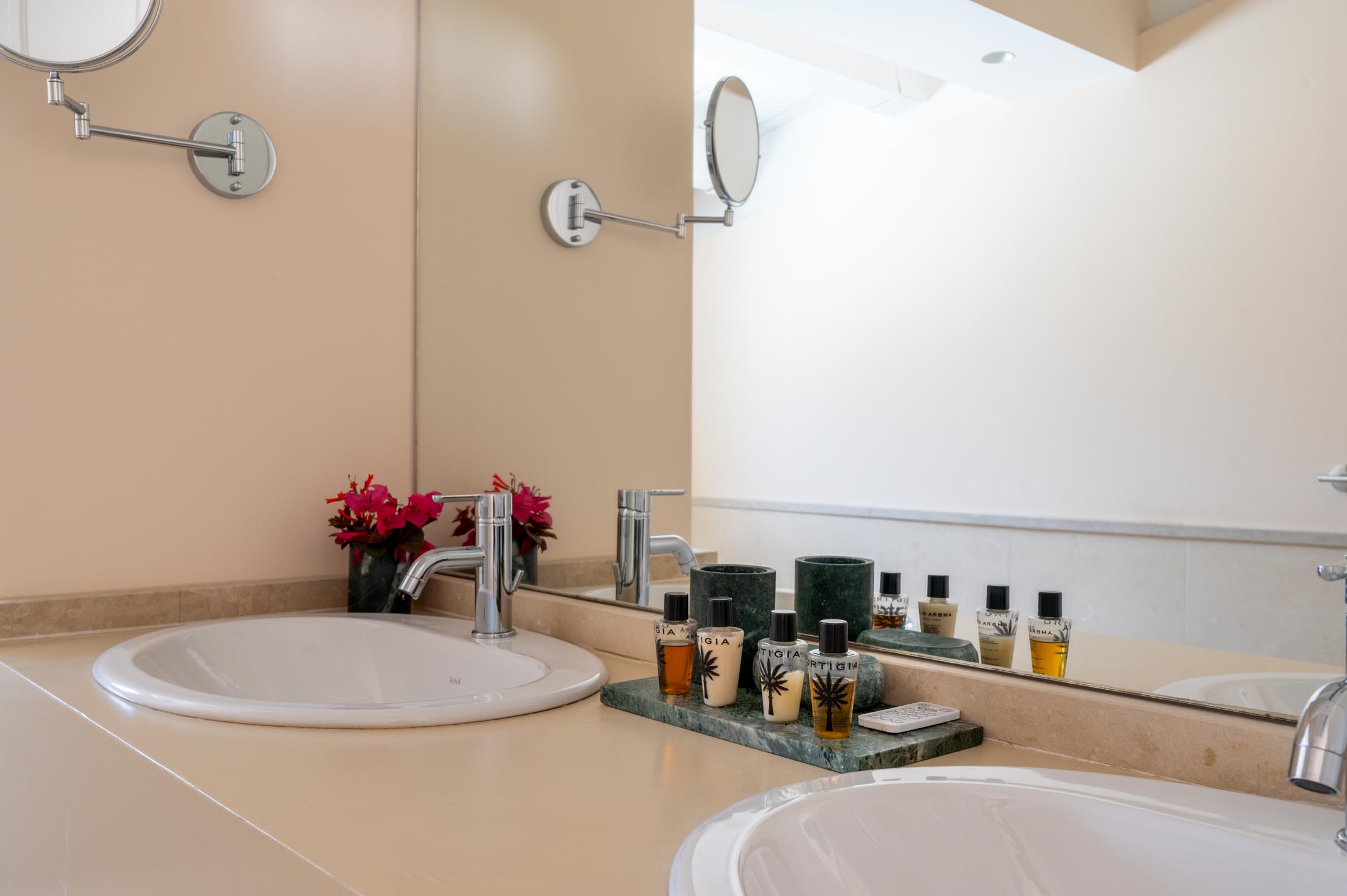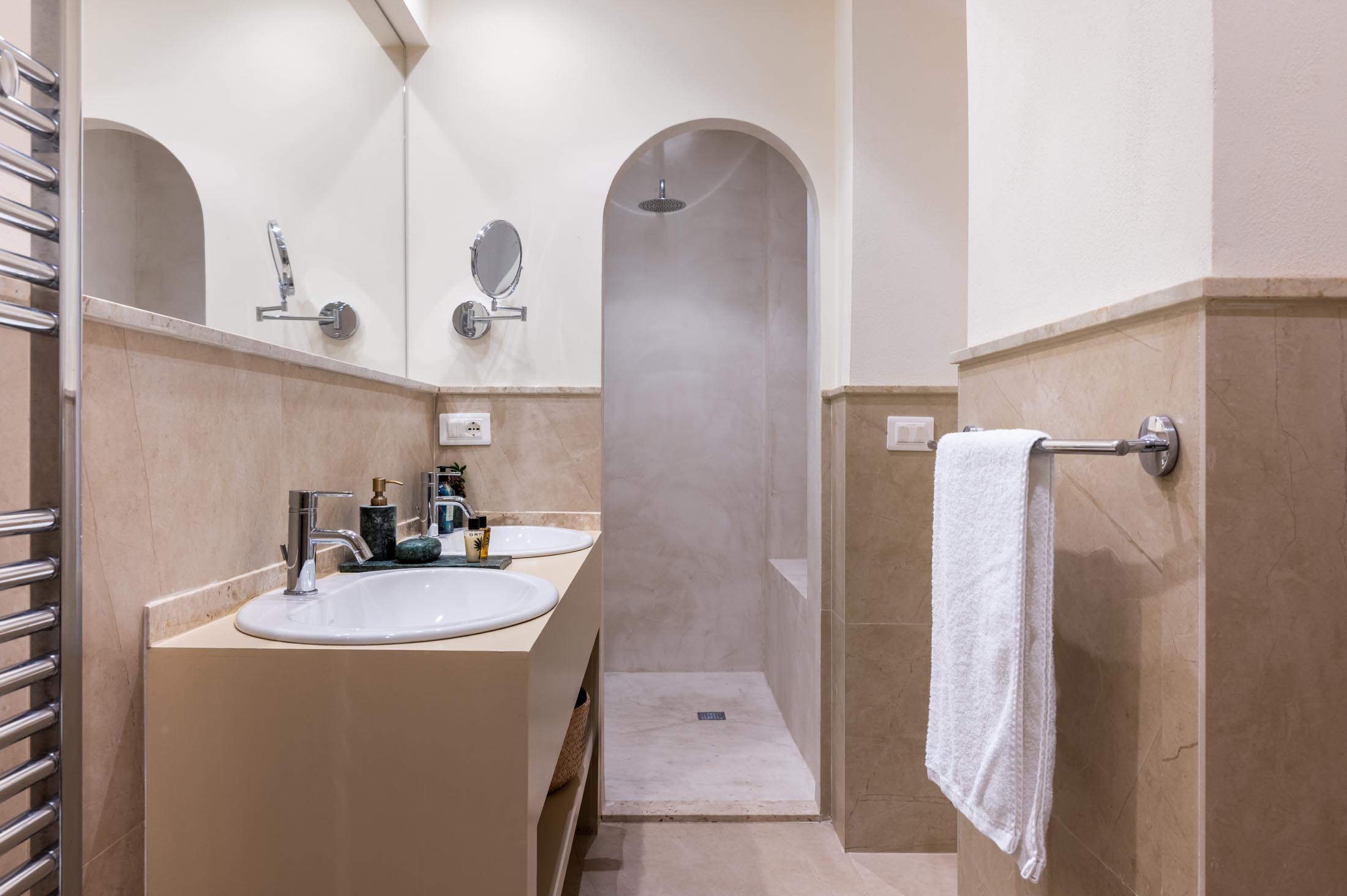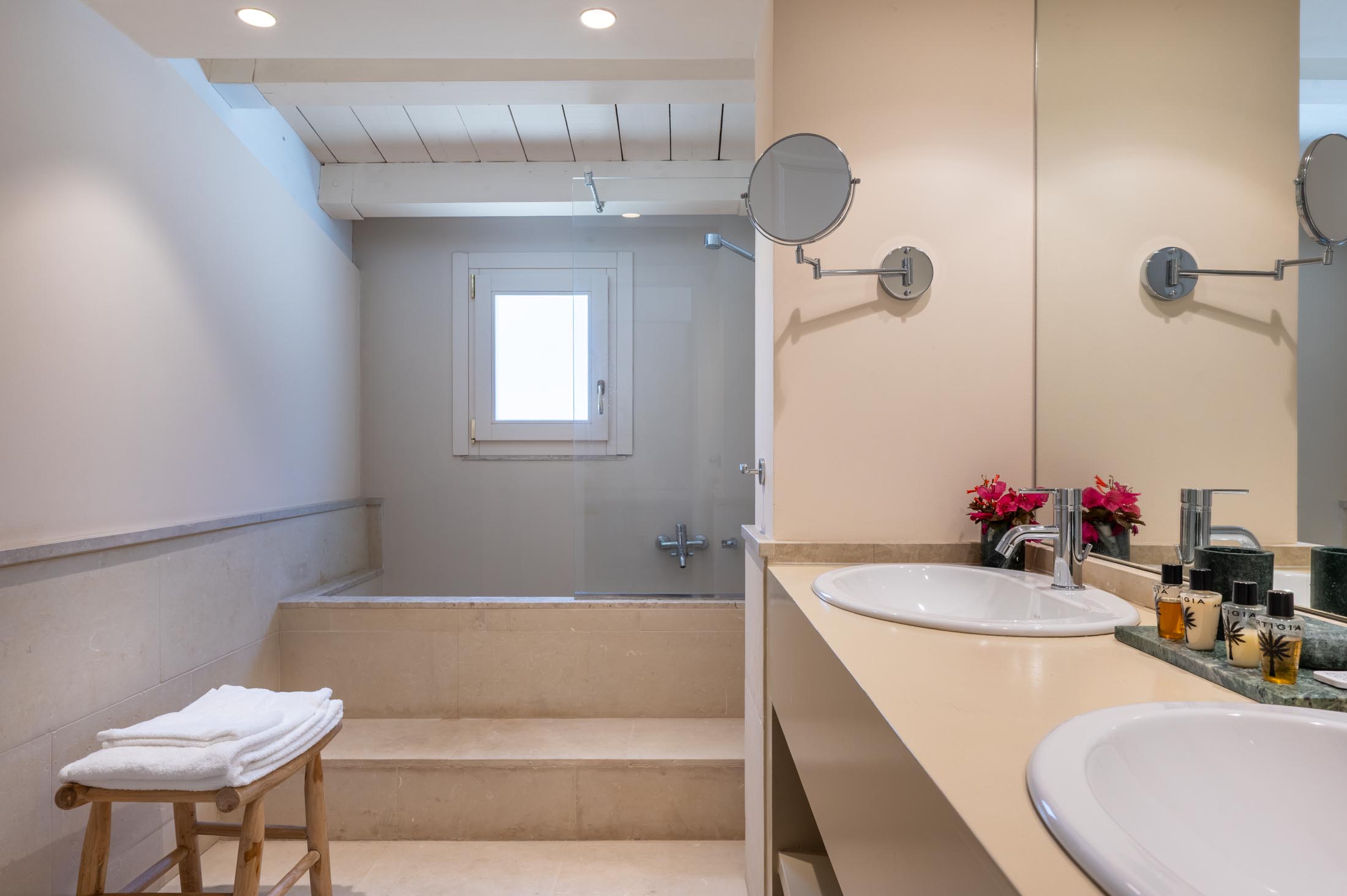 On the same floor, two suites and additional bedrooms offer private bathrooms, terraces, and direct garden access. Each sleeping area is thoughtfully separated from the common spaces to ensure maximum privacy for guests.