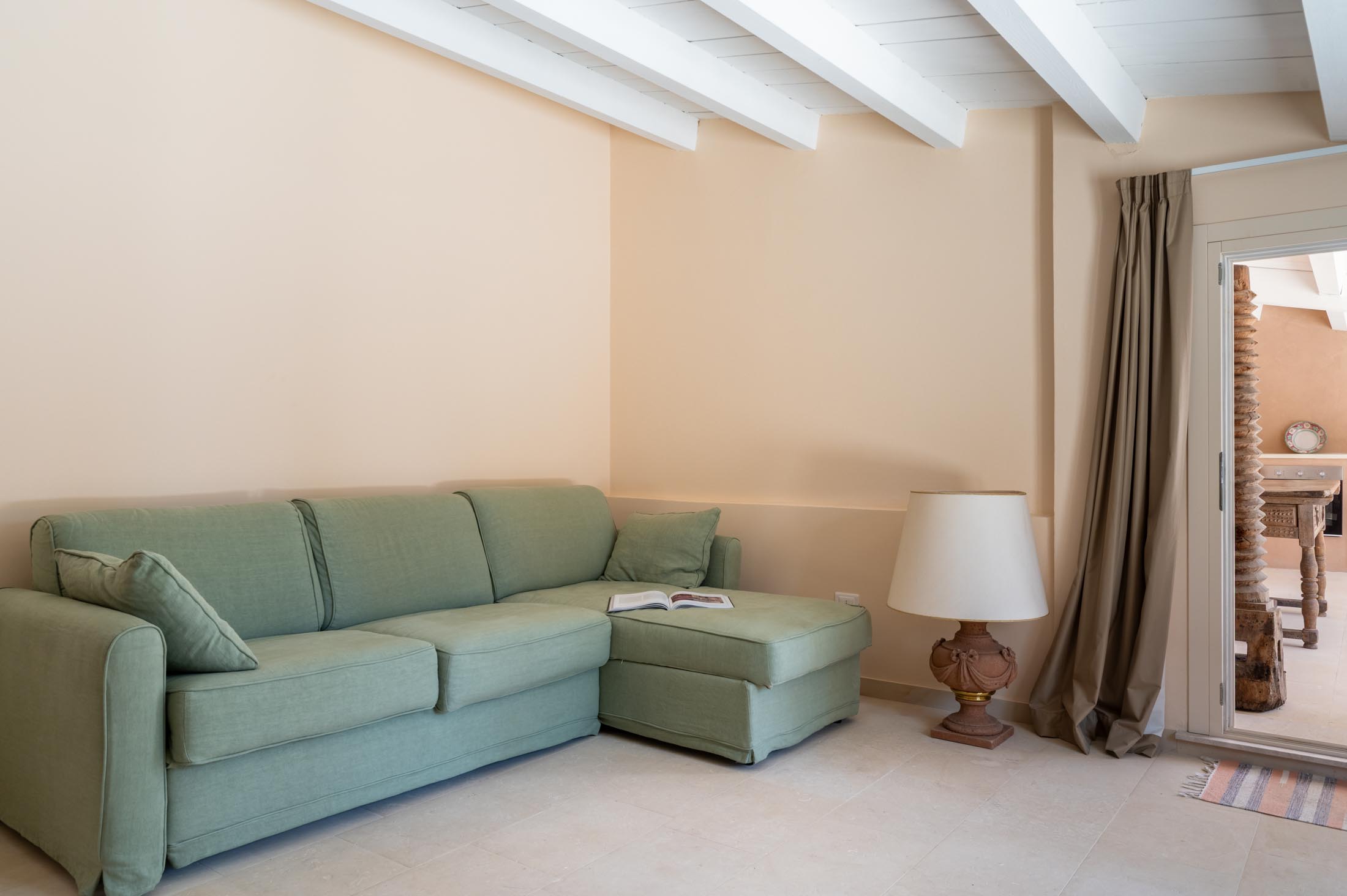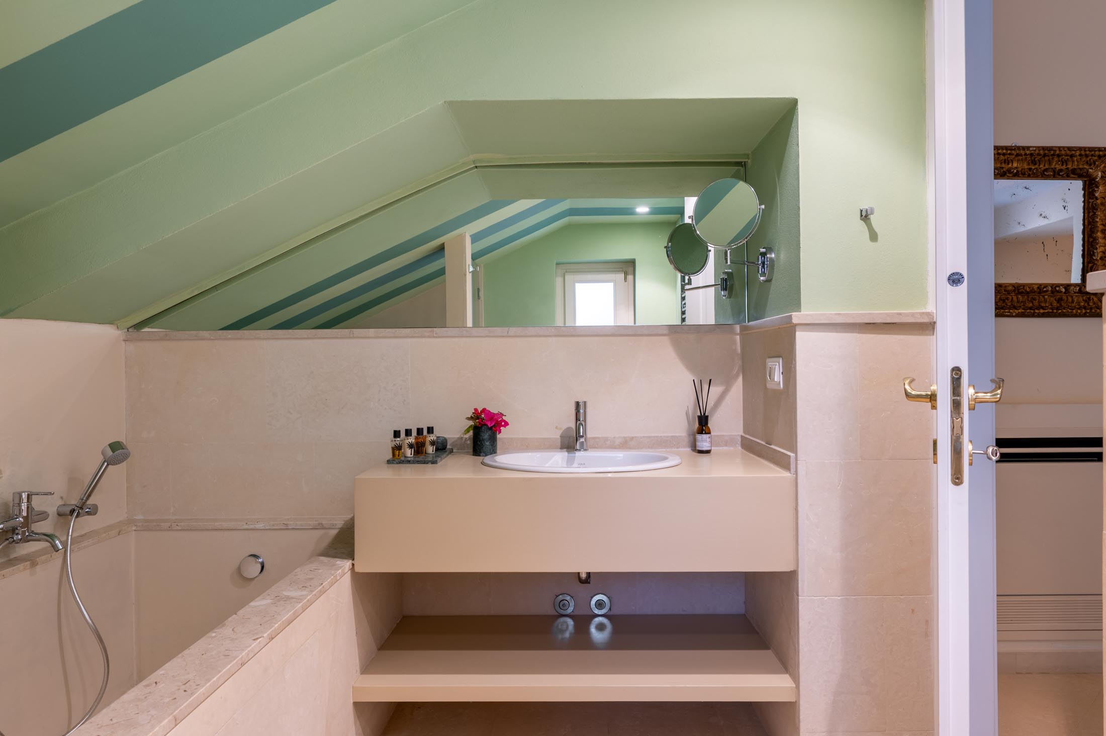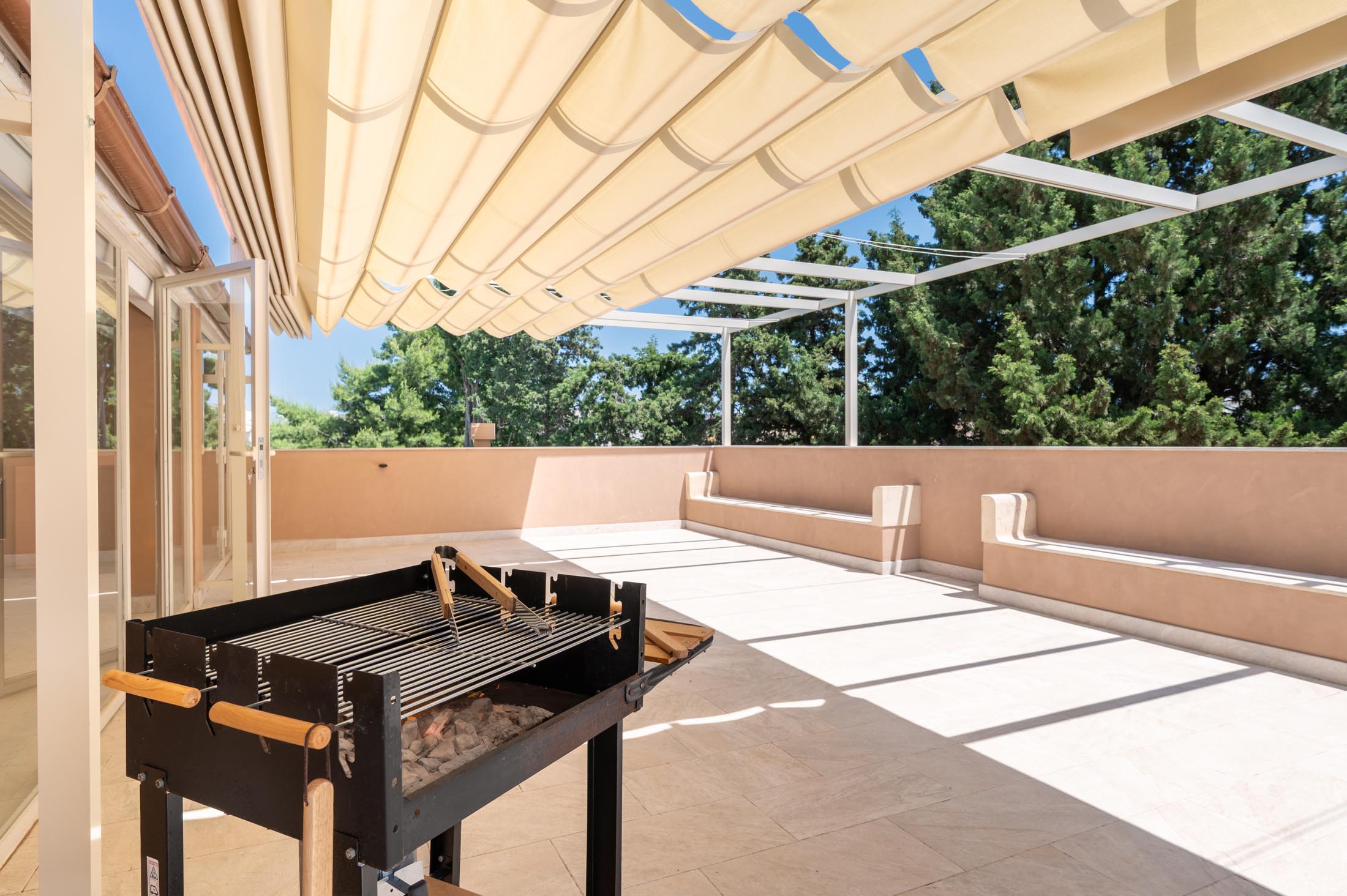 The top floor attic, reachable via two staircases or the elevator, features three terraces: one with panoramic views—ideal for sunset aperitivi—another equipped with a BBQ and outdoor kitchen for relaxed evenings, and a third, more intimate and secluded terrace.