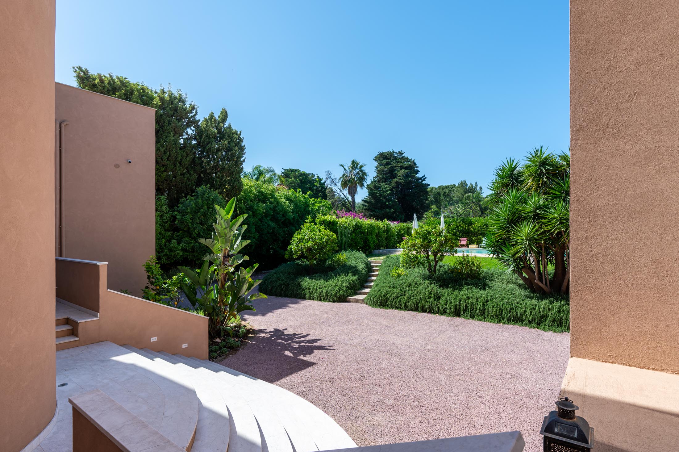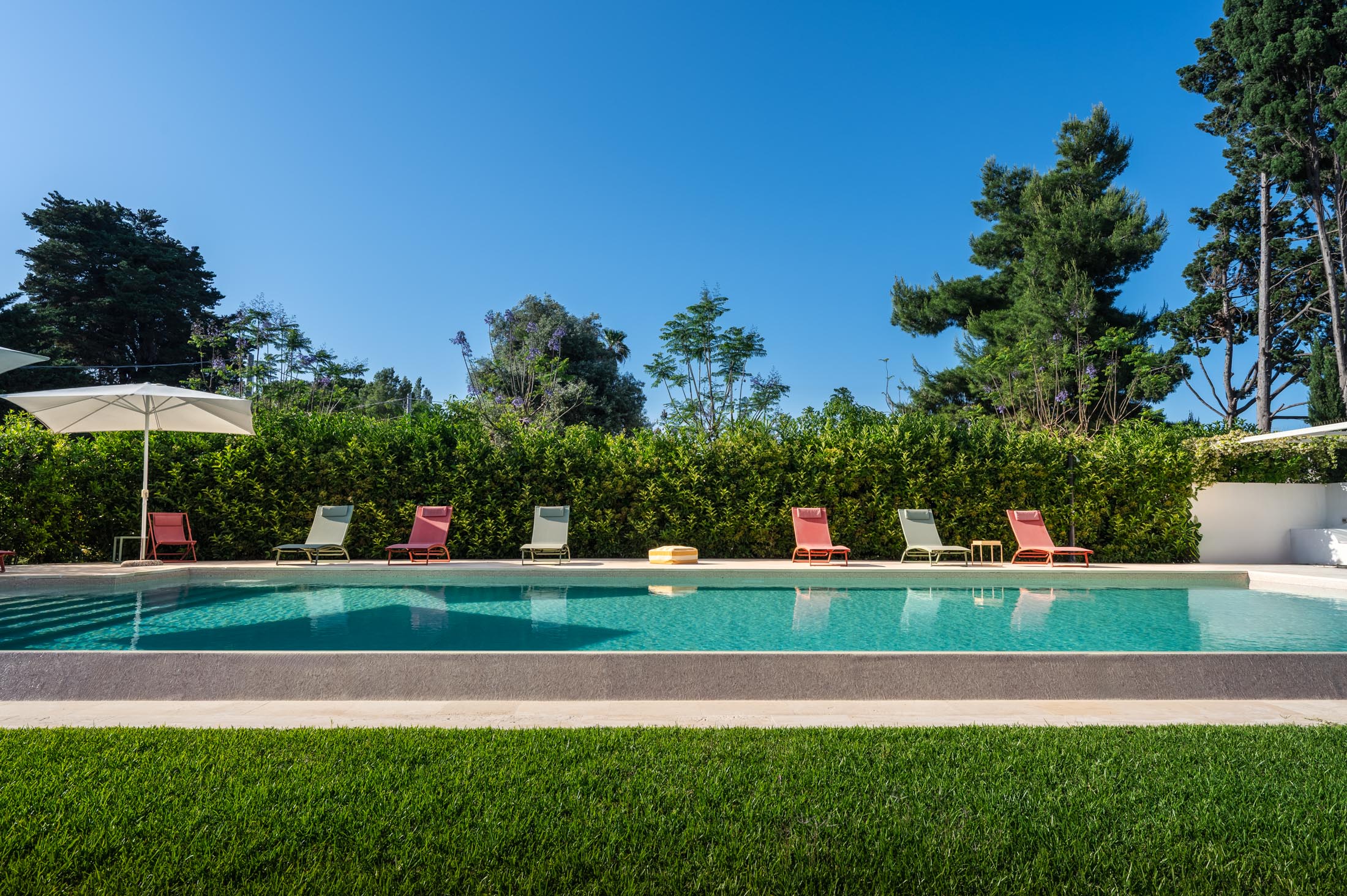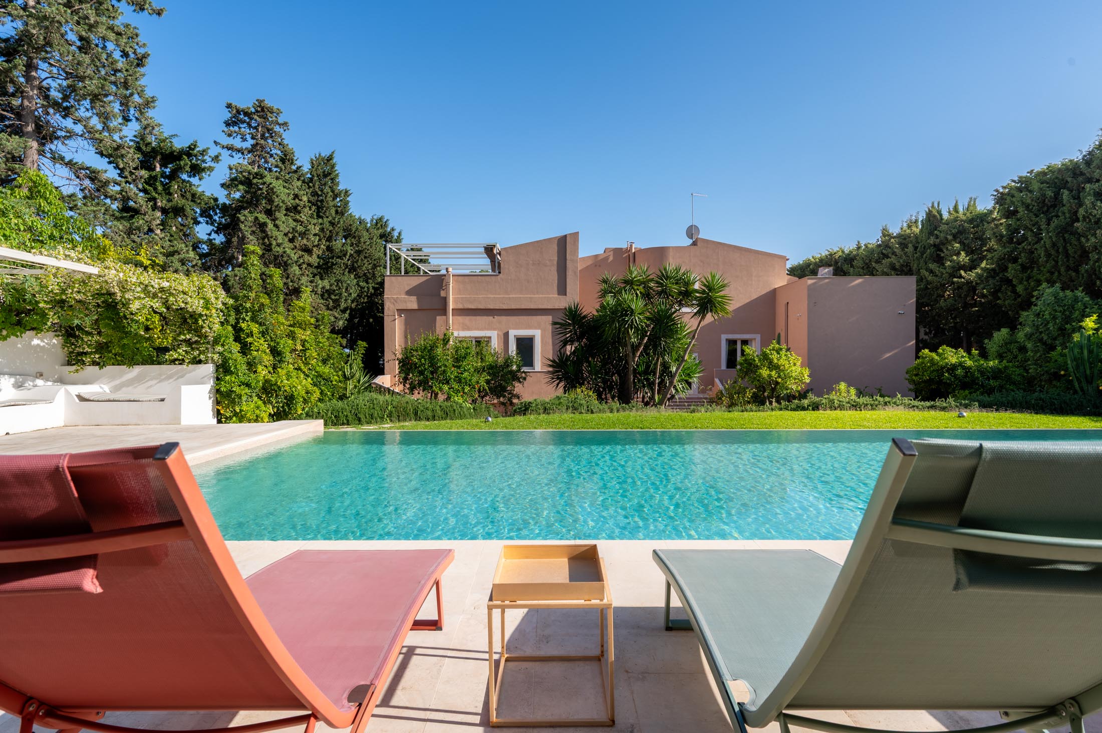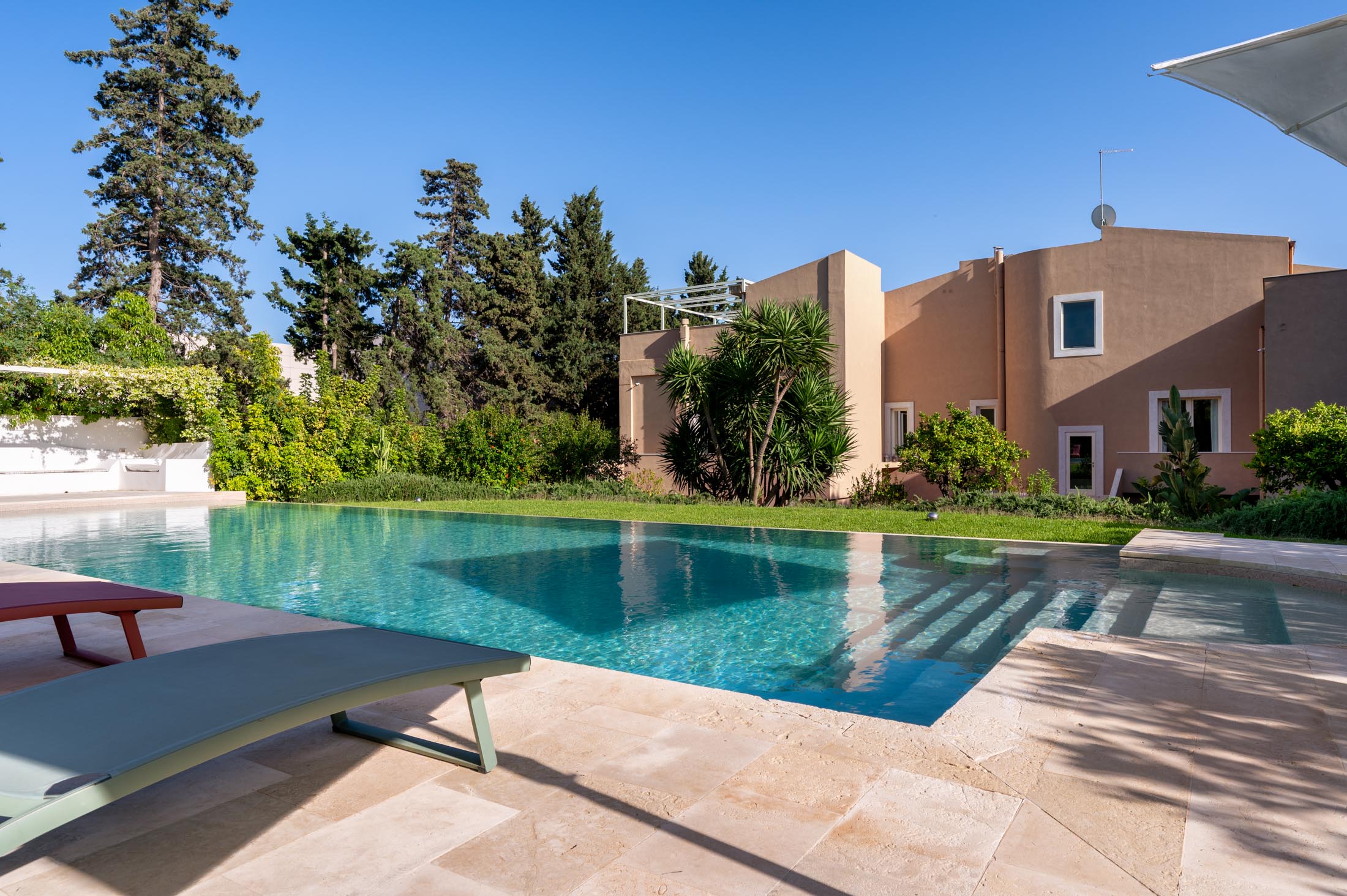 The spacious lawn and the tall trees surrounding the villa offer natural shade and privacy during the warm Sicilian summers. At the heart of the garden lies a large 15 × 6 metre swimming pool, framed by lush vegetation and featuring a comfortable shaded area—ideal for relaxing and unwinding on hot summer days.