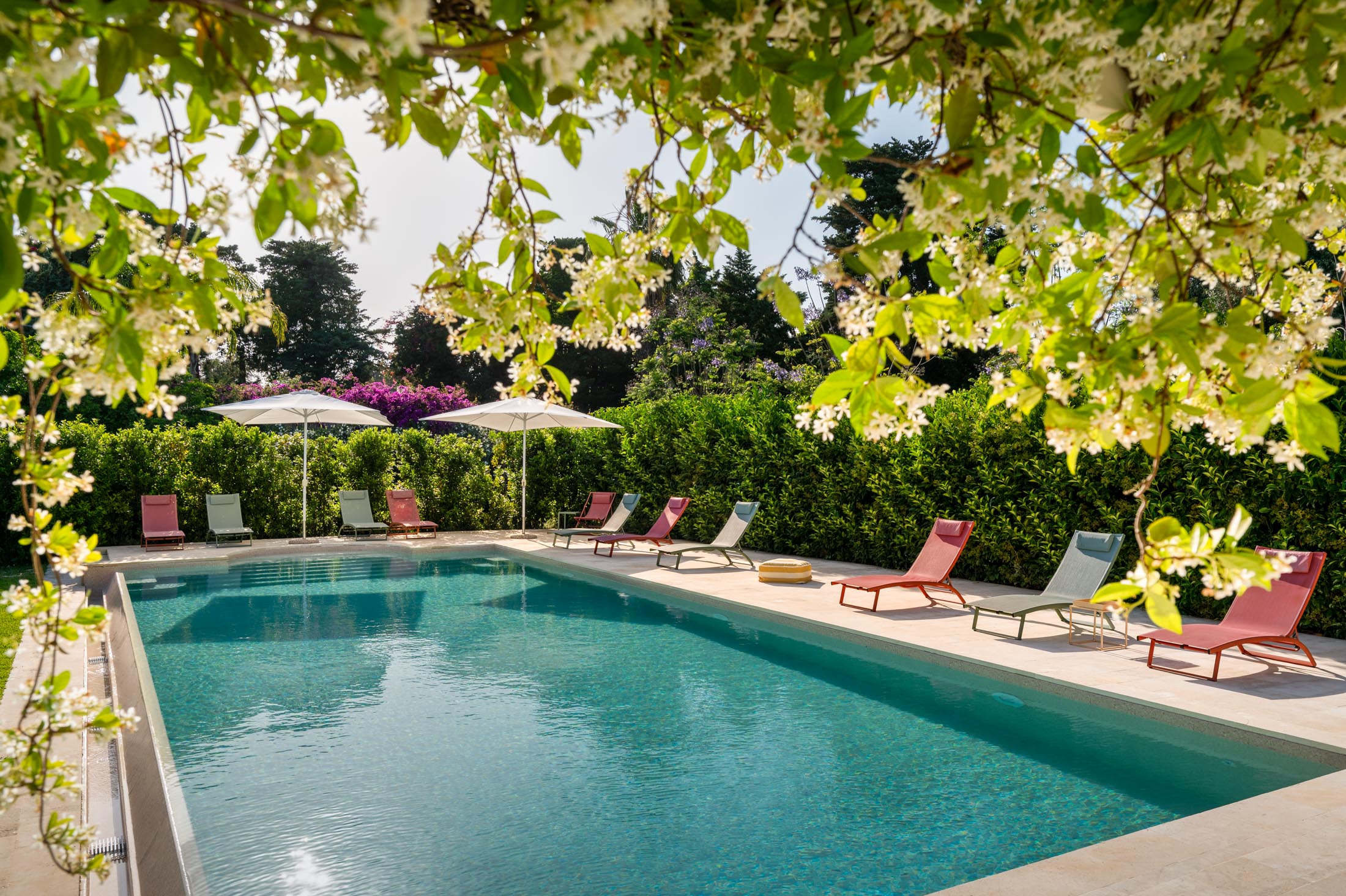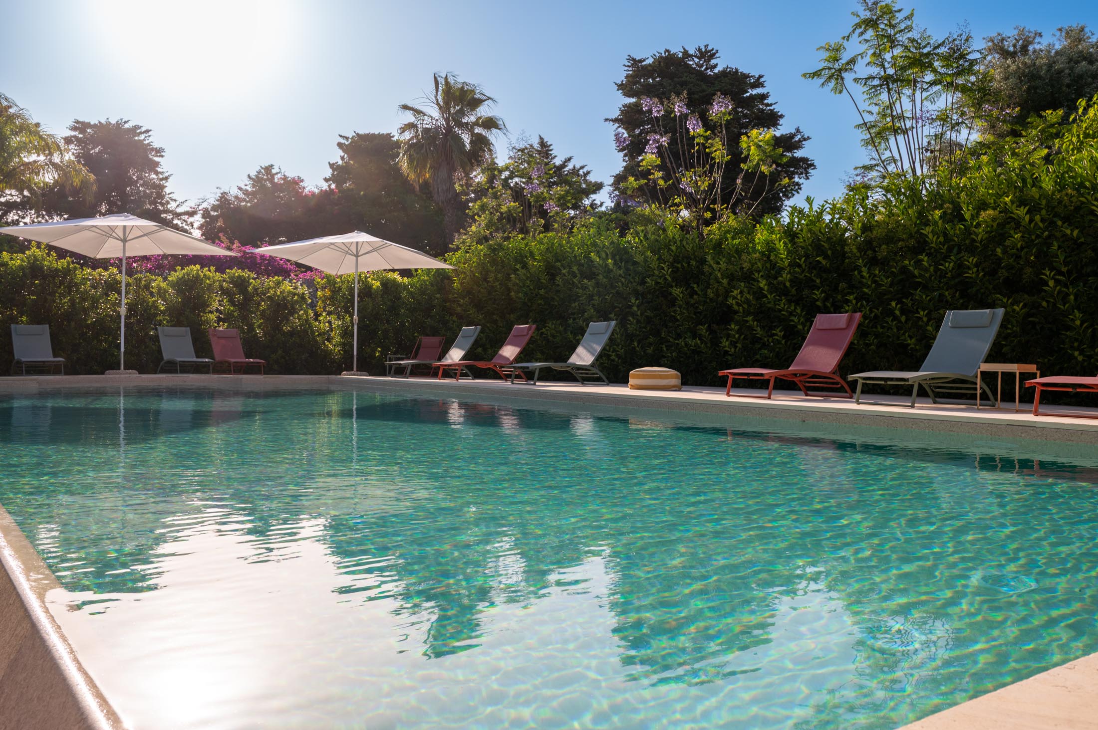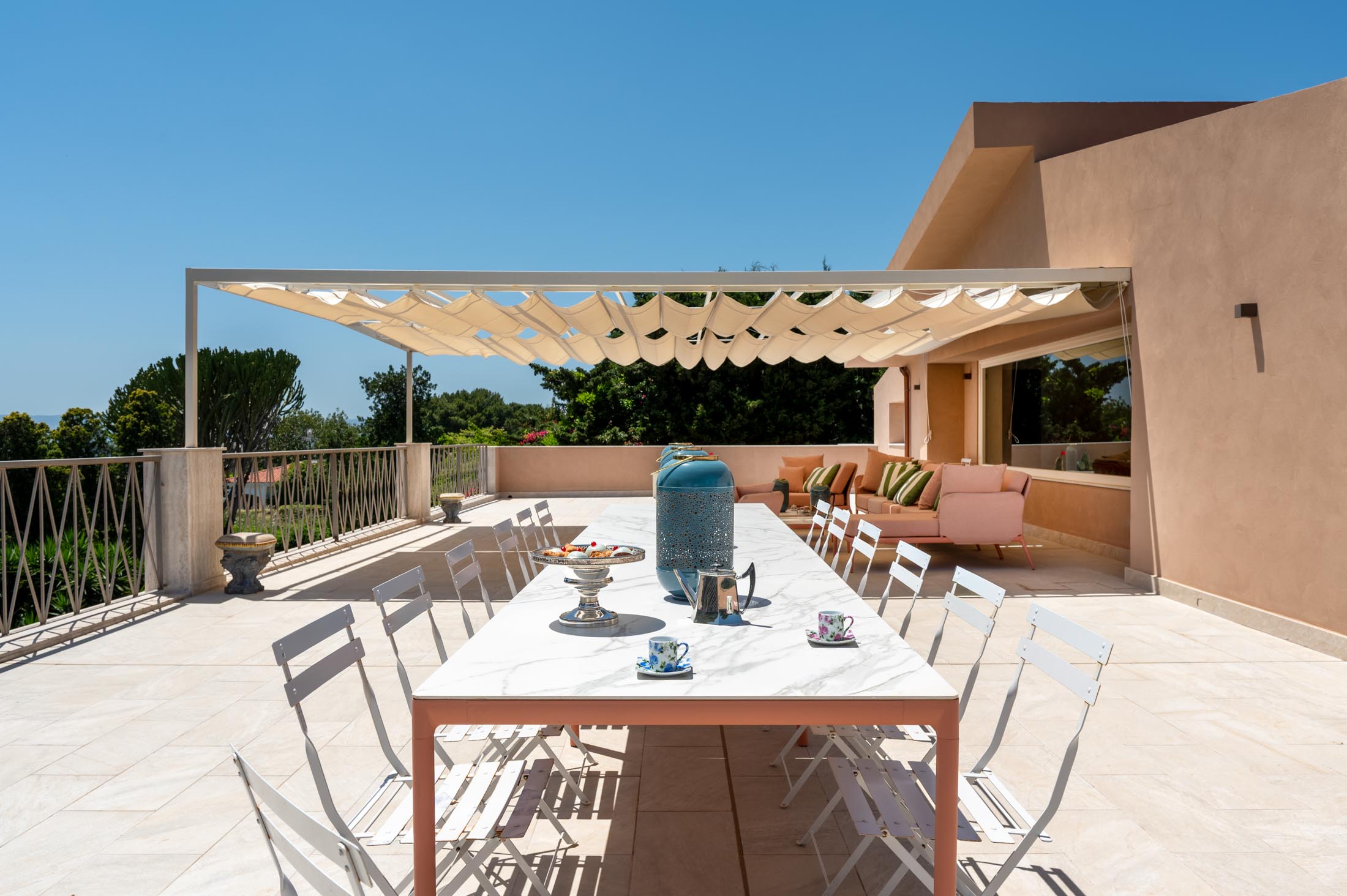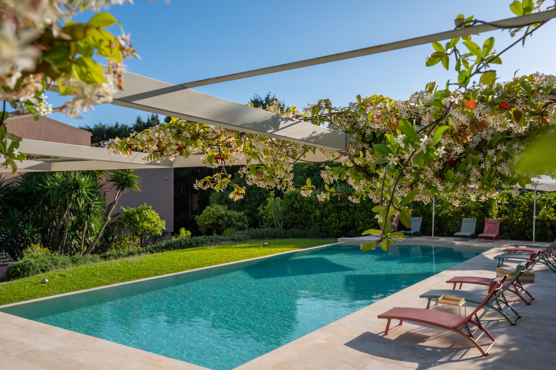 The spacious lawn and the tall trees surrounding the villa offer natural shade and privacy during the warm Sicilian summers. At the heart of the garden lies a large 15 × 6 metre swimming pool, framed by lush vegetation and featuring a comfortable shaded area—ideal for relaxing and unwinding on hot summer days.